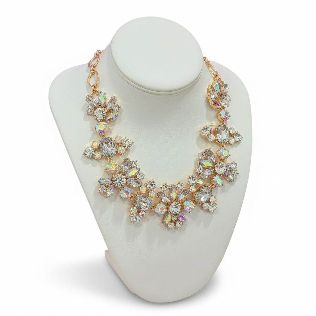 Designed to turn heads, this statement necklace features bold clusters of shimmering crystal stones that catch the light from every angle ✨ The structured silhouette delivers high-impact sparkle with a modern, elevated feel, making it the perfect finishing touch for evening looks, special occasions, or dressing up simple outfits. Glamorous yet wearable, this necklace is made to stand out and shine as the focal point of your look 💫