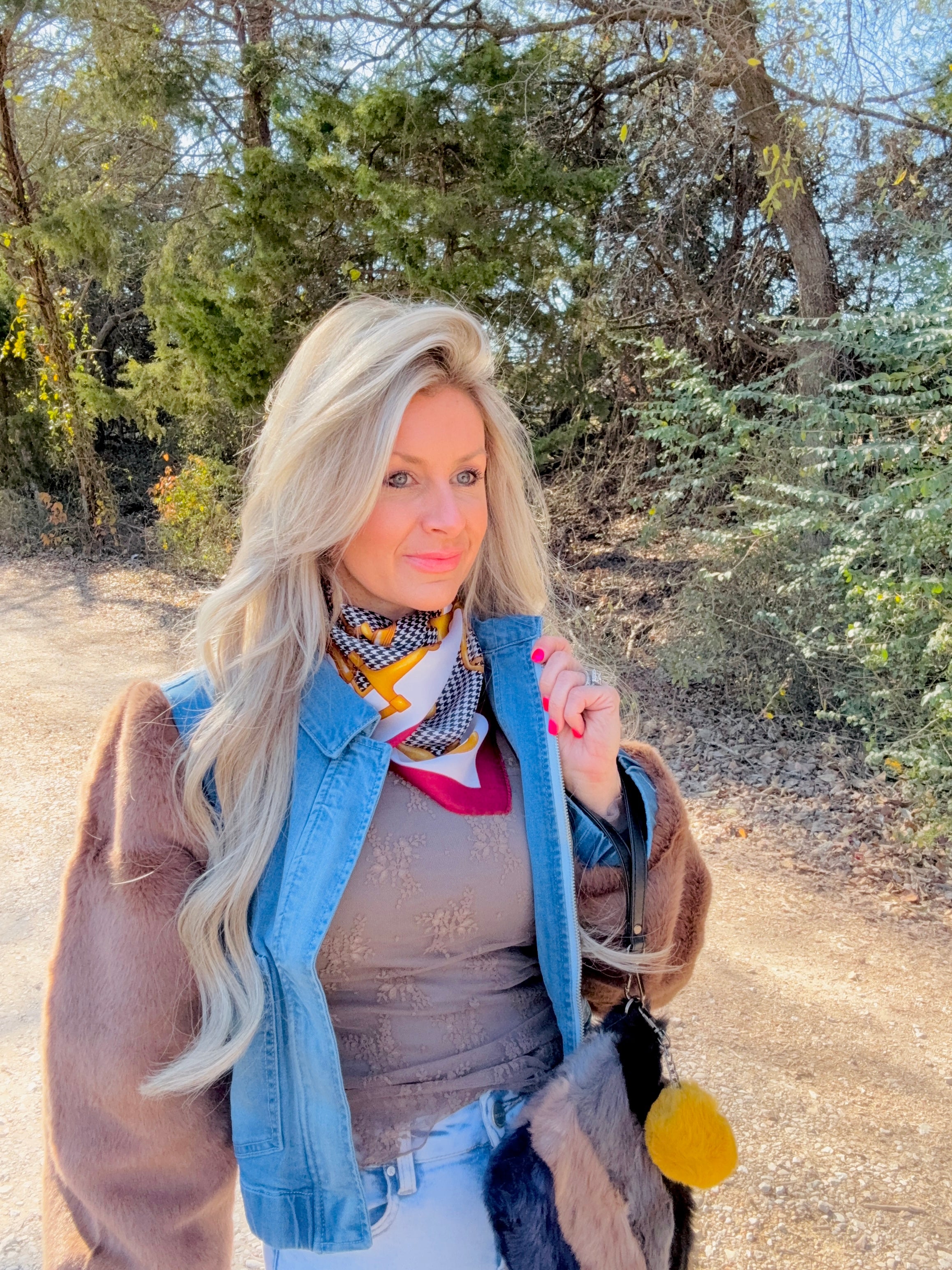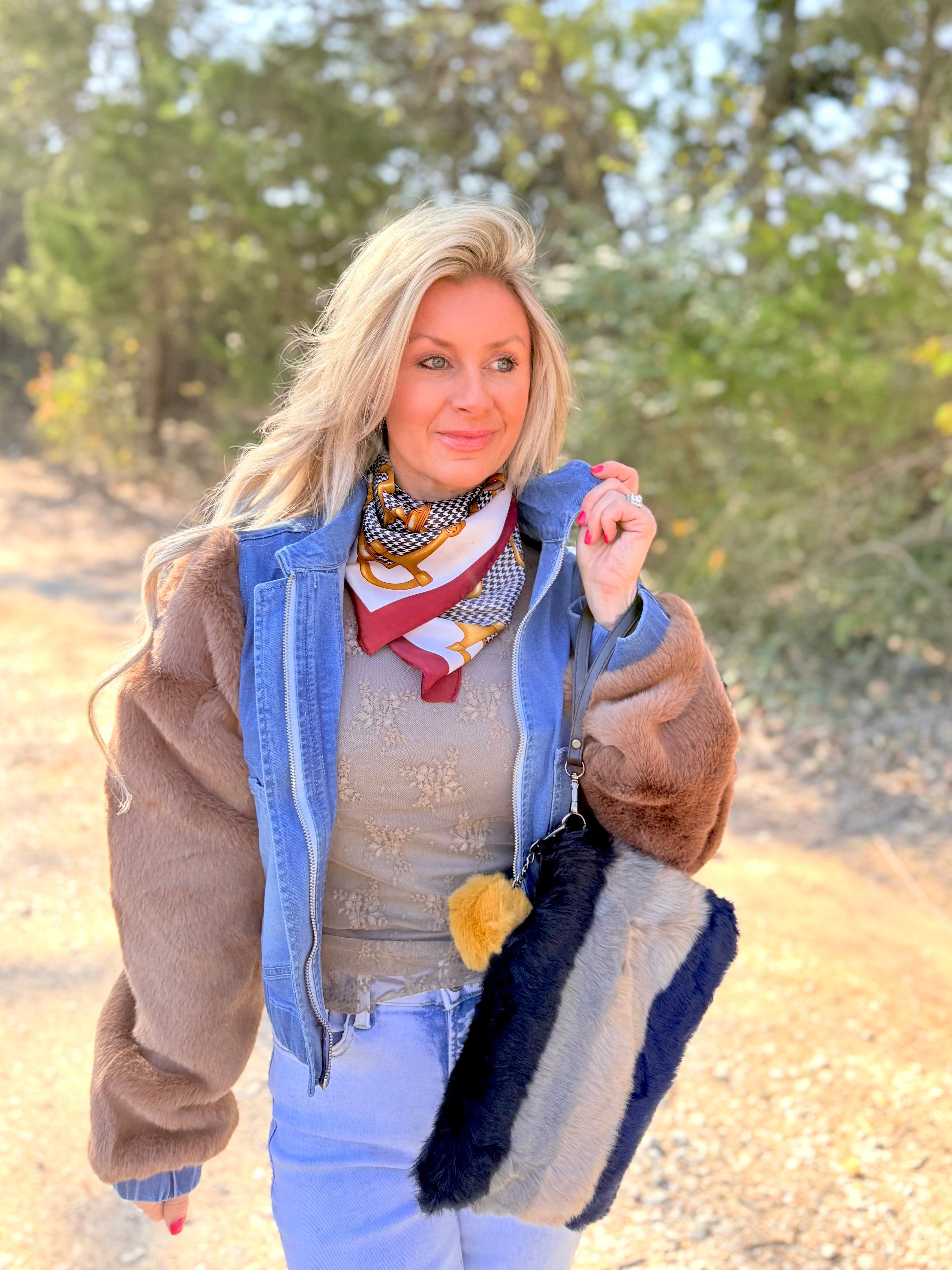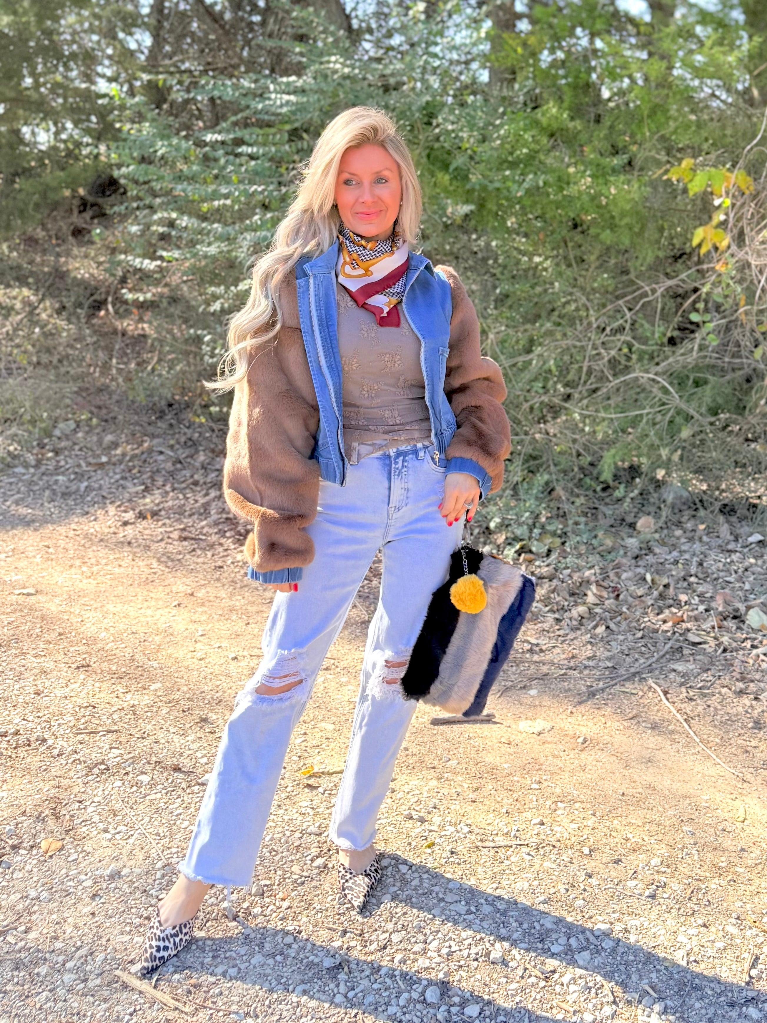 This long sleeve denim jacket is lined with soft sherpa for the perfect blend of warmth and casual style. Designed with a zip-up front and a comfortable, slightly cropped fit, it’s made from a cotton-blend fabric with a hint of stretch for easy movement. Ideal for layering on chilly days, this jacket pairs effortlessly with denim, leggings, or cozy knits.