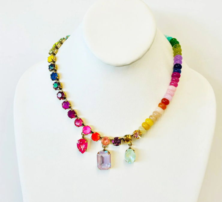 Add a touch of vintage charm to your outfit with our Glitterbelle Necklace in Fairy Crush. Made with high quality crystals, beautiful beads on antique gold plated brass, this 15" necklace (with an extra 3" extension) brings a touch of elegance and playfulness to your look.