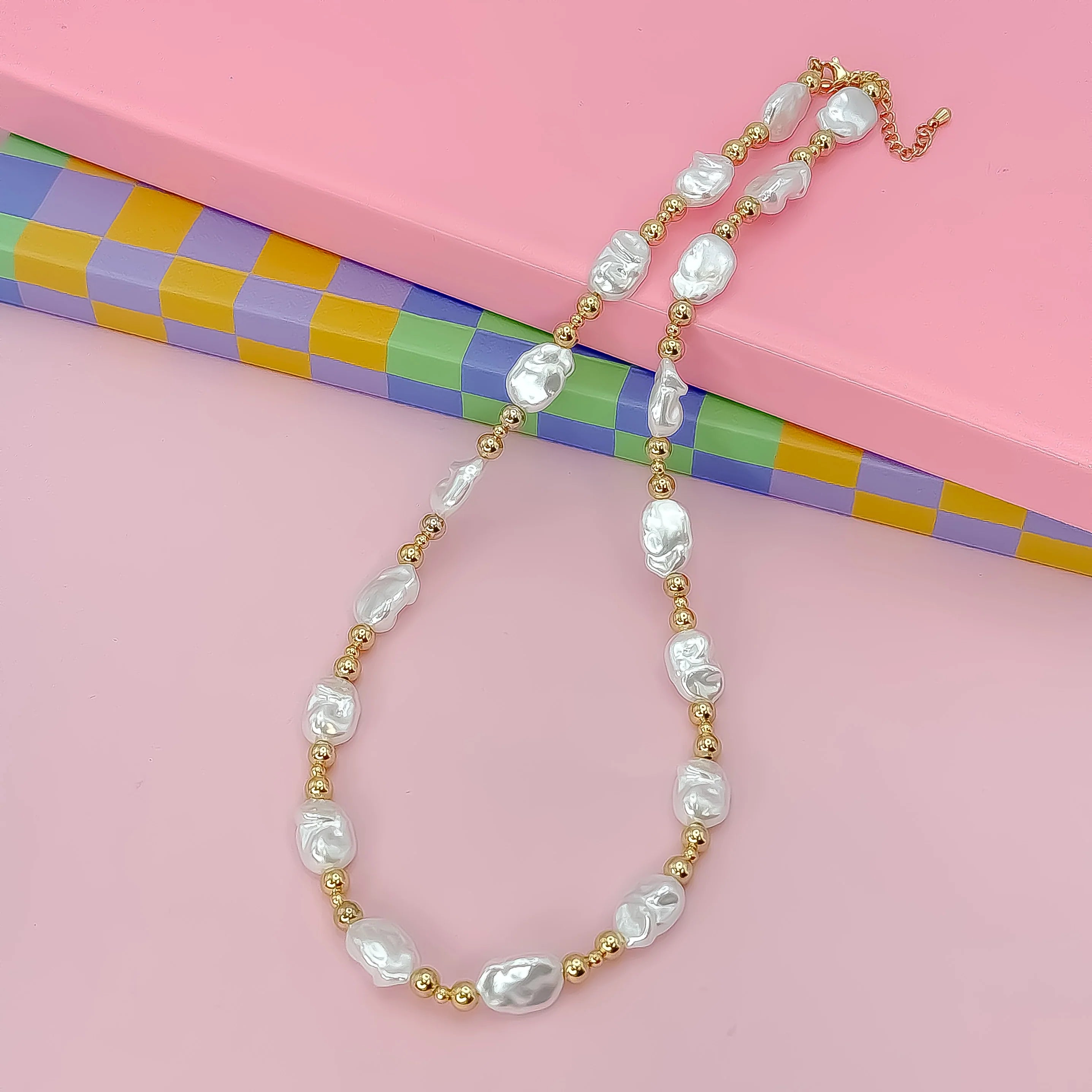 Elegant yet playful, this necklace features lustrous irregular pearls paired with polished gold beads for a timeless statement that shines 💫 Perfect for layering or wearing solo, it adds just the right touch of glow to elevate any look. Finished with a clear coat for lasting color and shine ✨