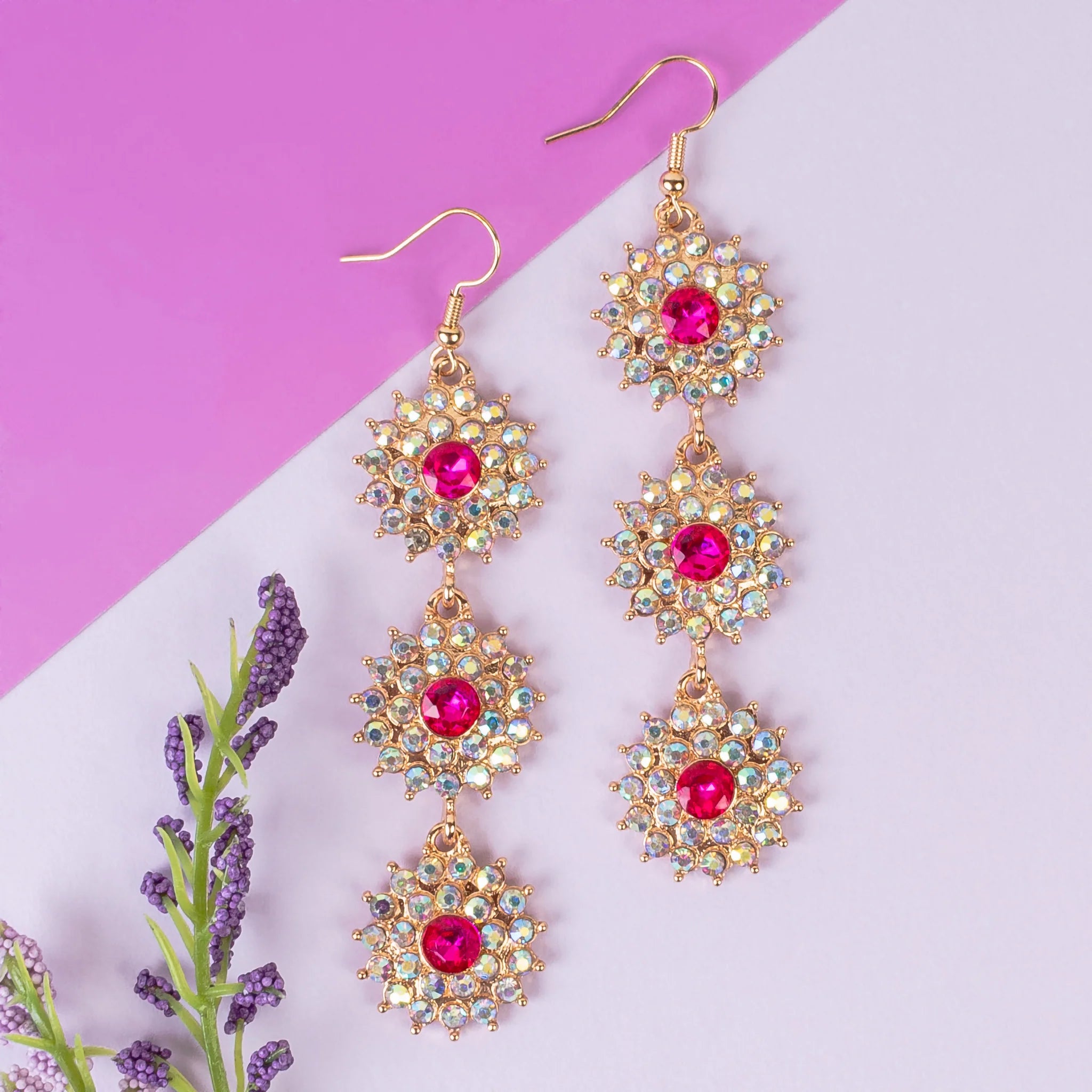 These statement earrings feature delicate floral shapes with shimmering rhinestone accents for a touch of glam 💎 Designed with a classic fish hook and a graceful 3.5" drop, they bring movement, shine, and floral flair to any look—perfect for everything from brunch dates to garden parties 🌷💫