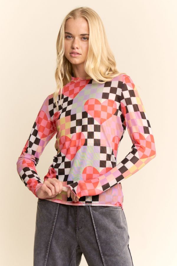 Make a bold statement in this long sleeve mesh top featuring a striking checkered heart print in vibrant mixed tones. Designed with a slim, stretchy fit, it’s perfect for layering under jackets or wearing on its own for an edgy, fashion-forward look. Lightweight and eye-catching, this piece brings playful energy and modern style to any outfit.