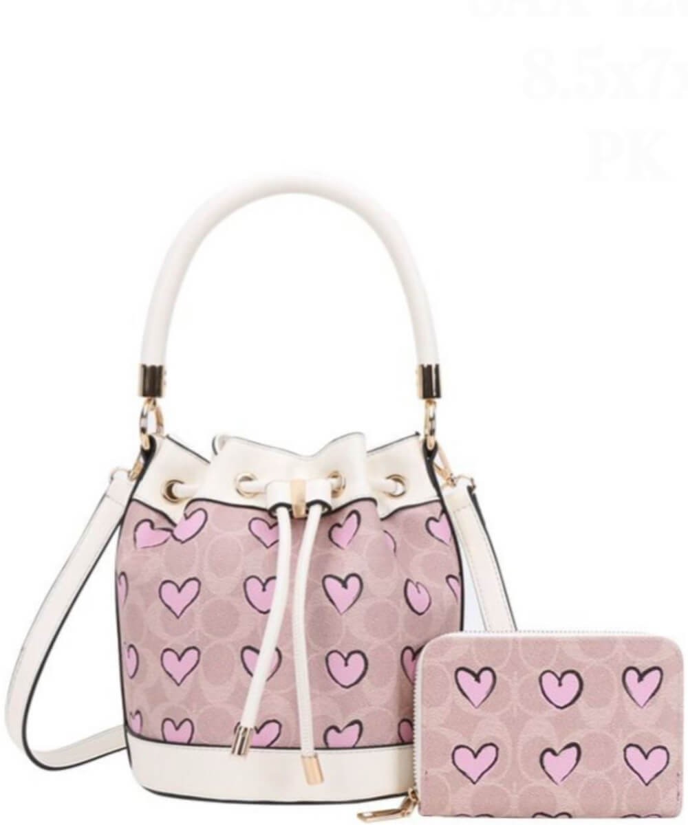 Charming and stylish, this heart monogram bucket bag adds the perfect feminine touch to your everyday look. Designed in a classic bucket silhouette with an allover heart monogram print, it comes with a matching wallet for easy organization. Compact yet roomy enough for daily essentials, this bag is both cute and practical—perfect for dressing up casual outfits.