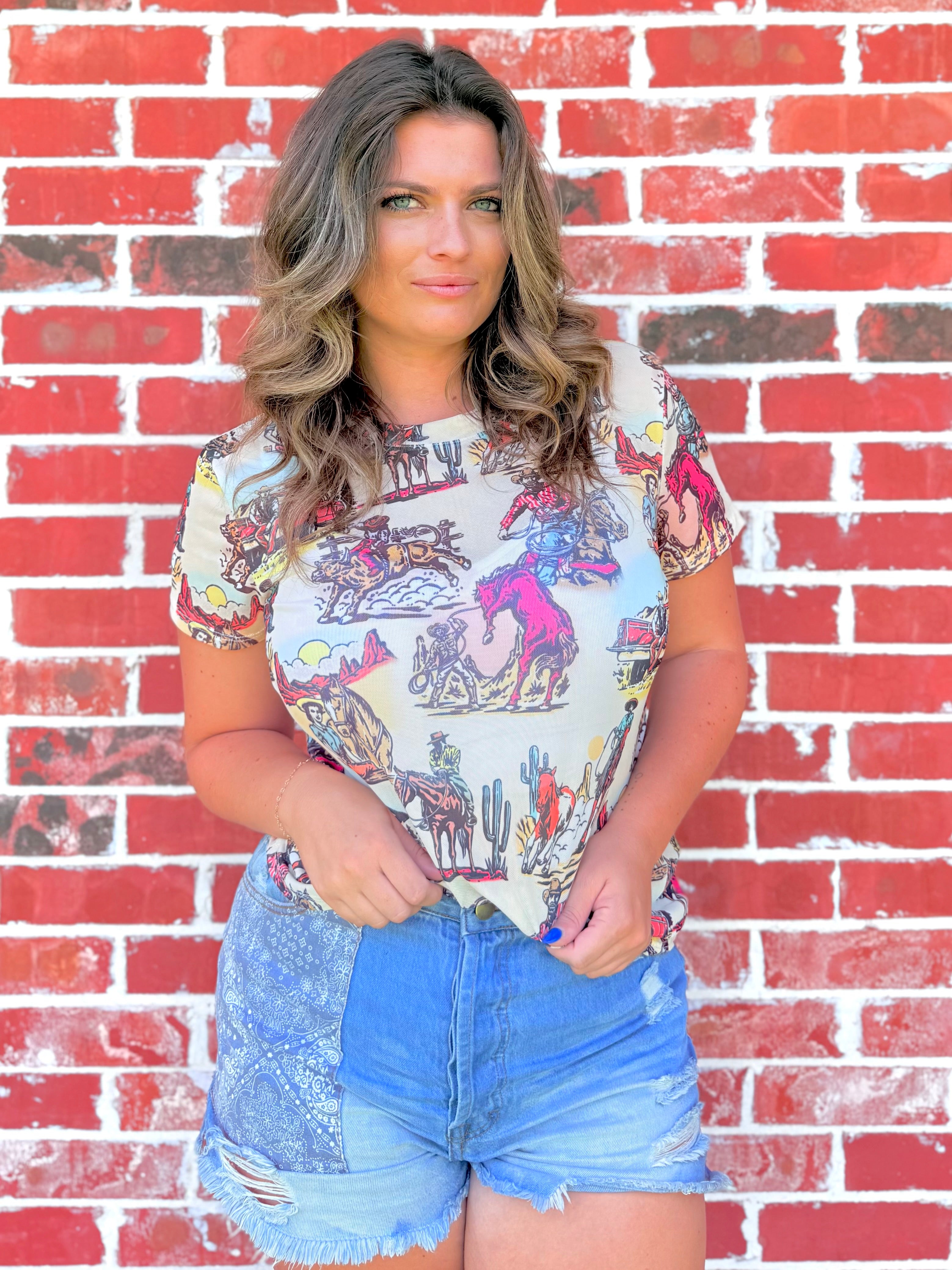 Saddle up in effortless style with the Tania Desert Dream Mesh Tee — a lightweight, breathable top featuring a bold Western cowboy graphic that’s perfect for vacation days, beach hangs, and Independence Day celebrations 🇺🇸.