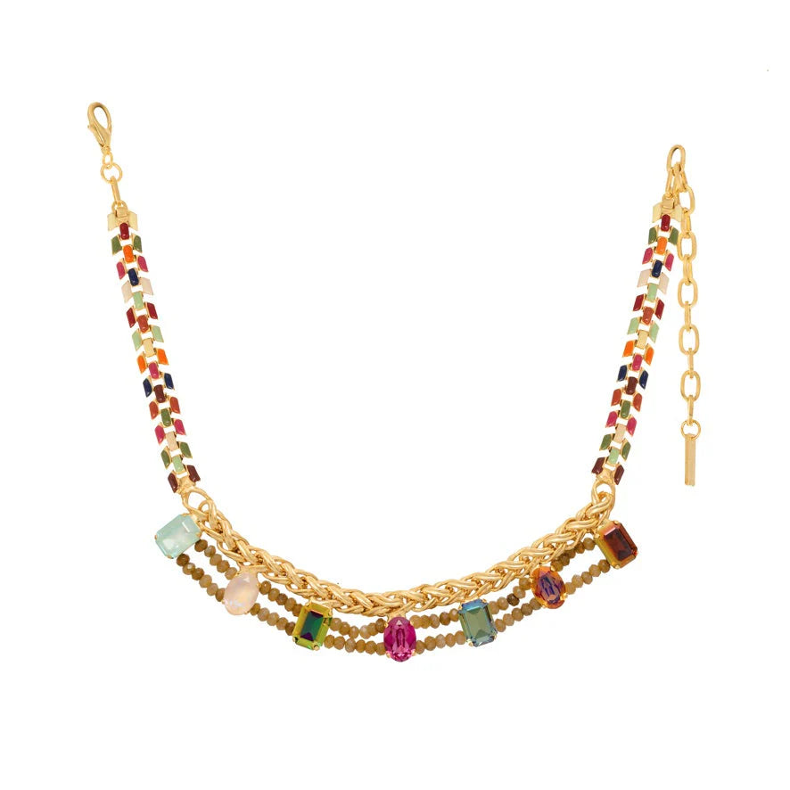Liven up your look with the Cyrilla Necklace! This sparkly stunner will have you turning heads, featuring high quality crystals, beautiful beads, antique gold-plated brass base metal, and hand painted enamel. Whether you're clinching a big deal or just looking to impress, this beauty's 14" chain and 3.5" extension will do the trick. Oh la la!