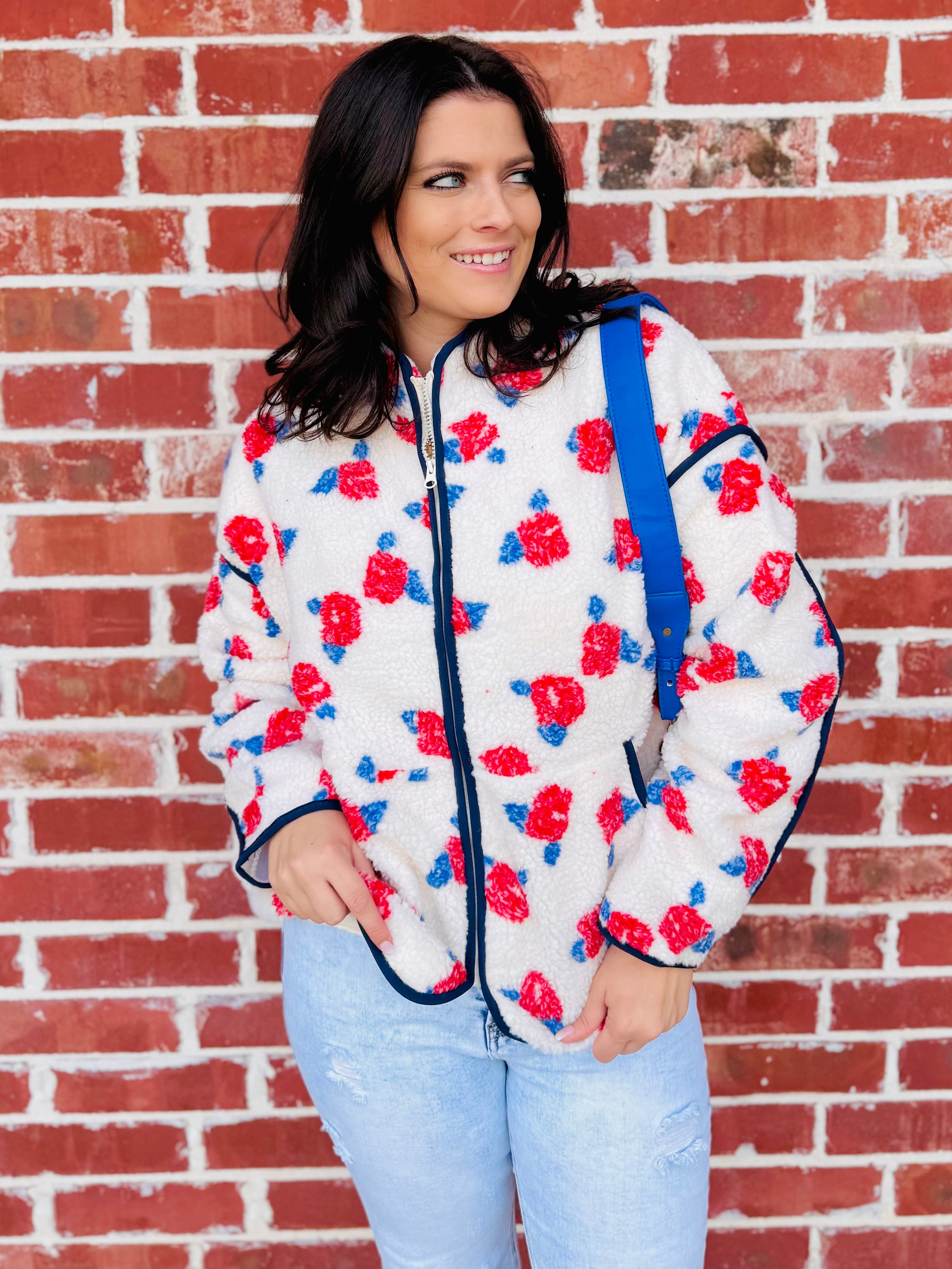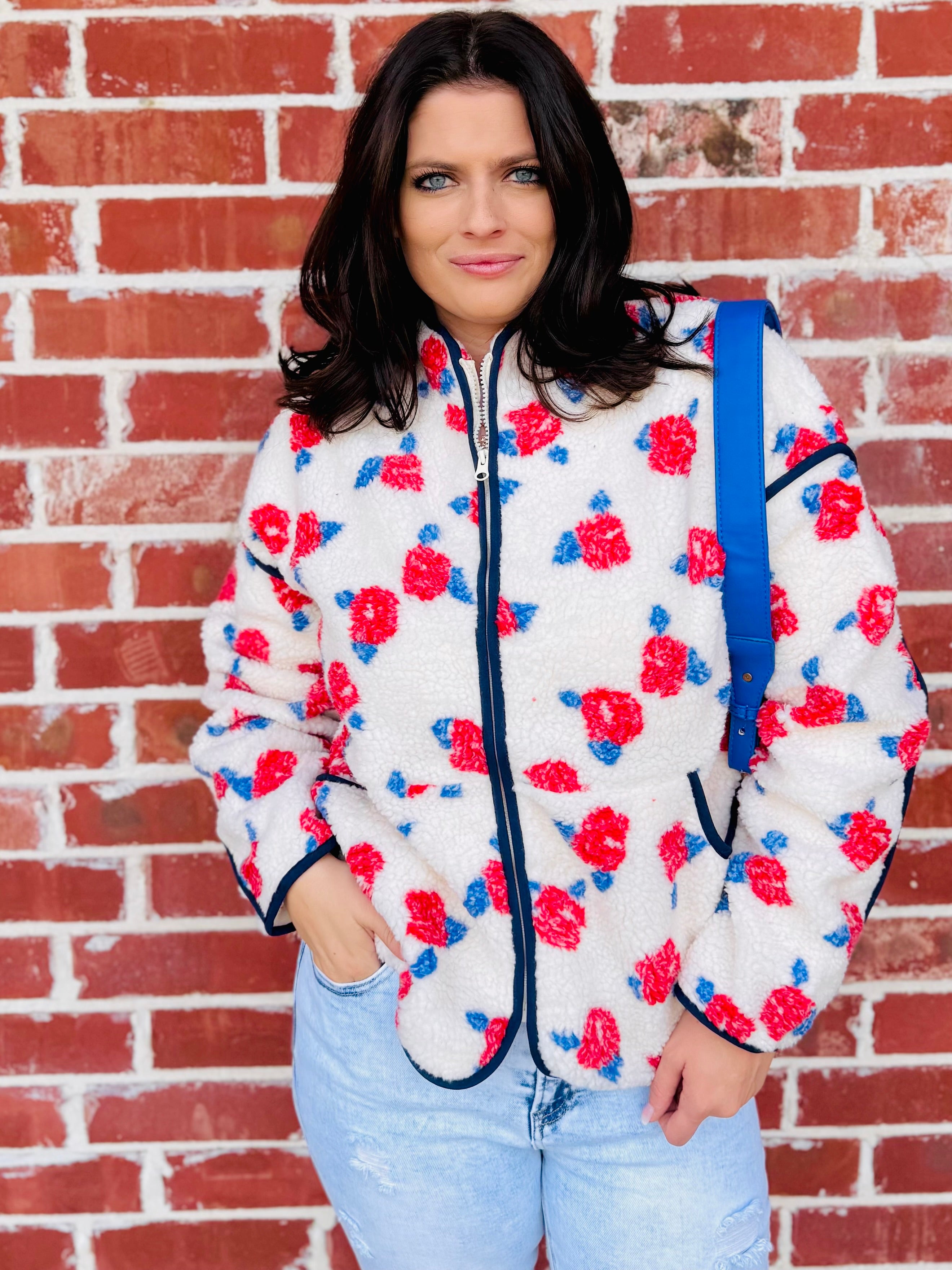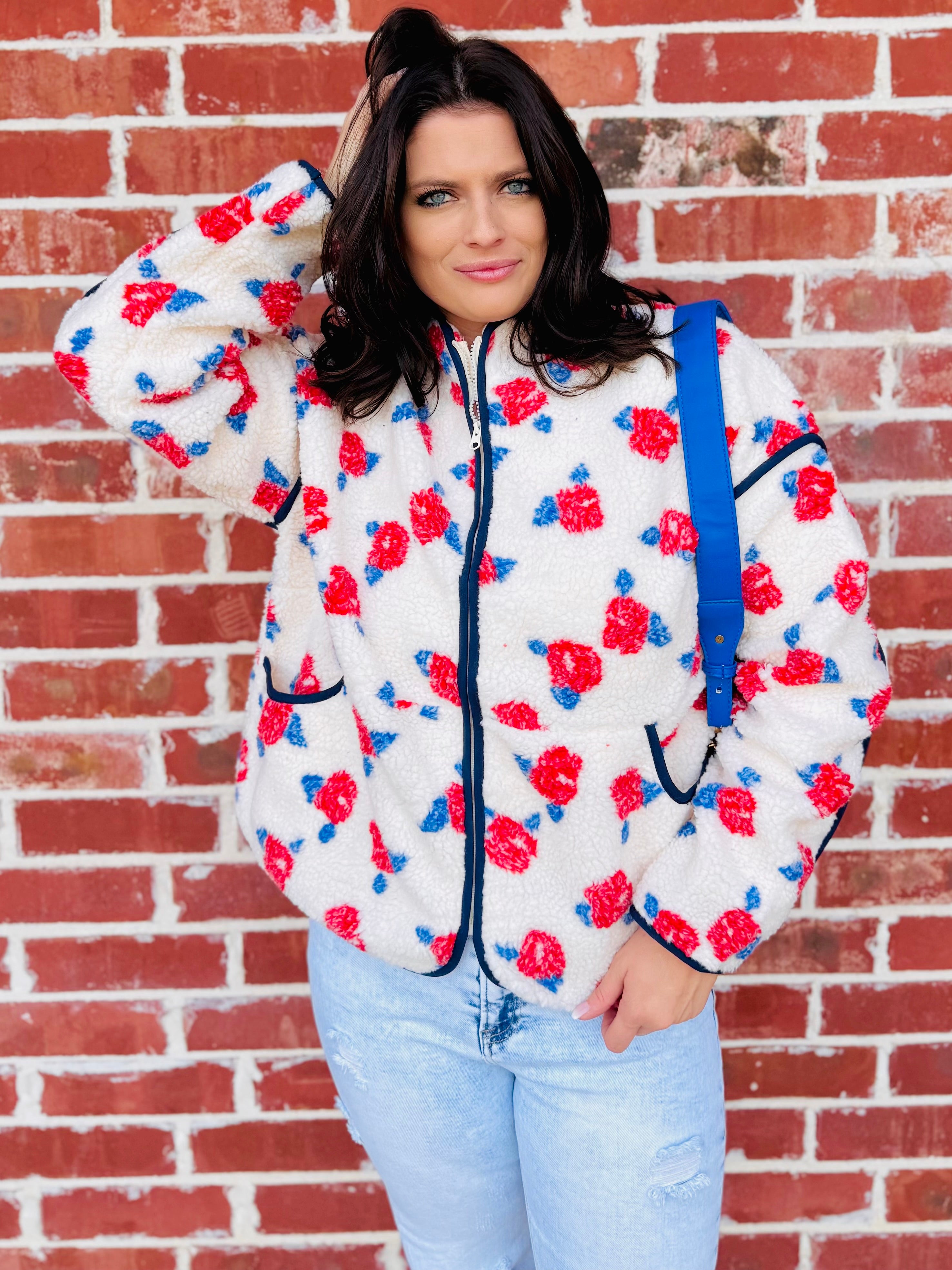 Stay warm and stylish in this oversized floral printed fleece jacket designed for effortless layering. Featuring a high neckline and a functional front zip-up closure, this jacket combines cozy comfort with eye-catching charm. The relaxed fit makes it perfect for throwing on over your everyday outfits while adding a fun pop of floral style.
