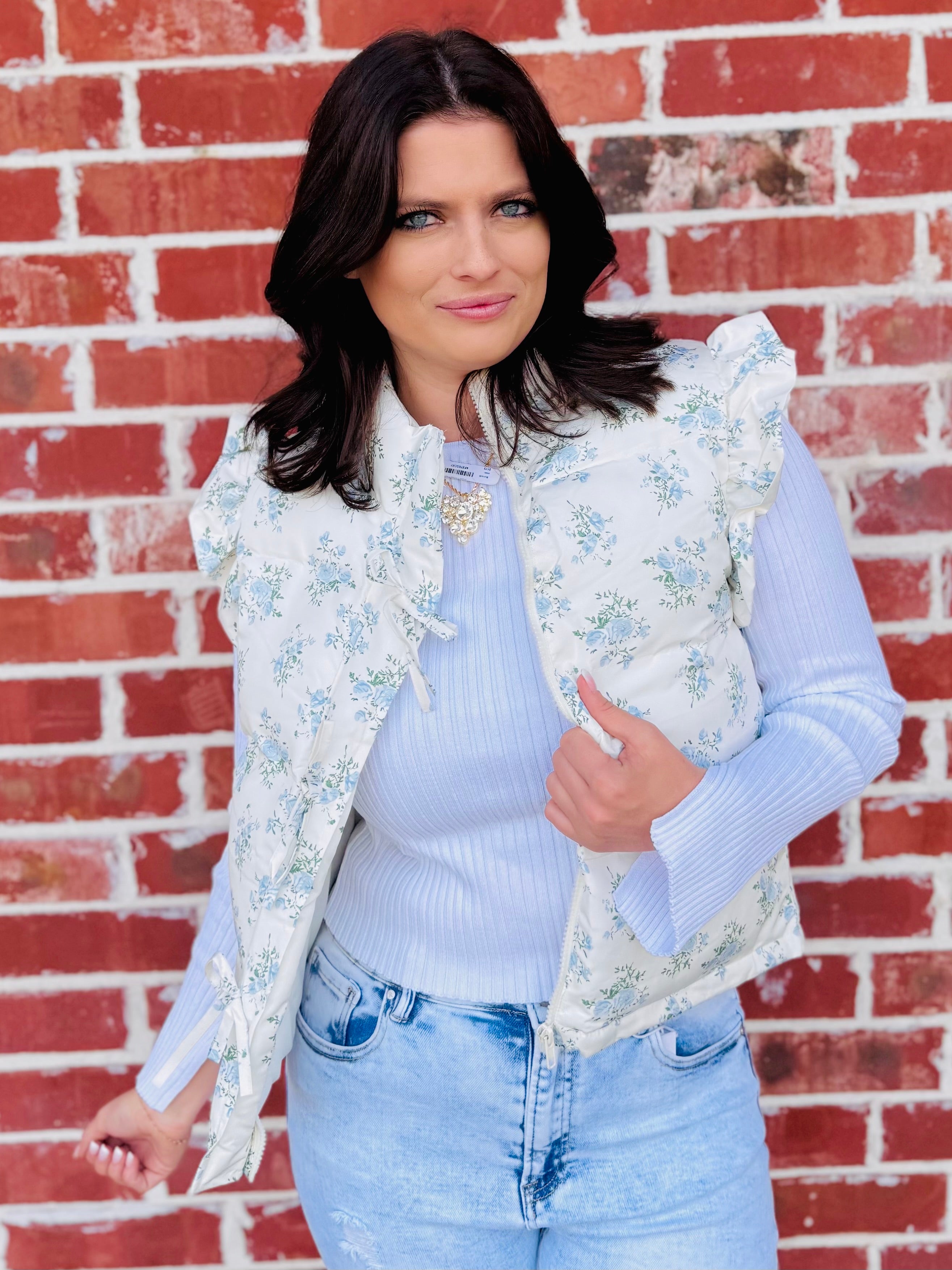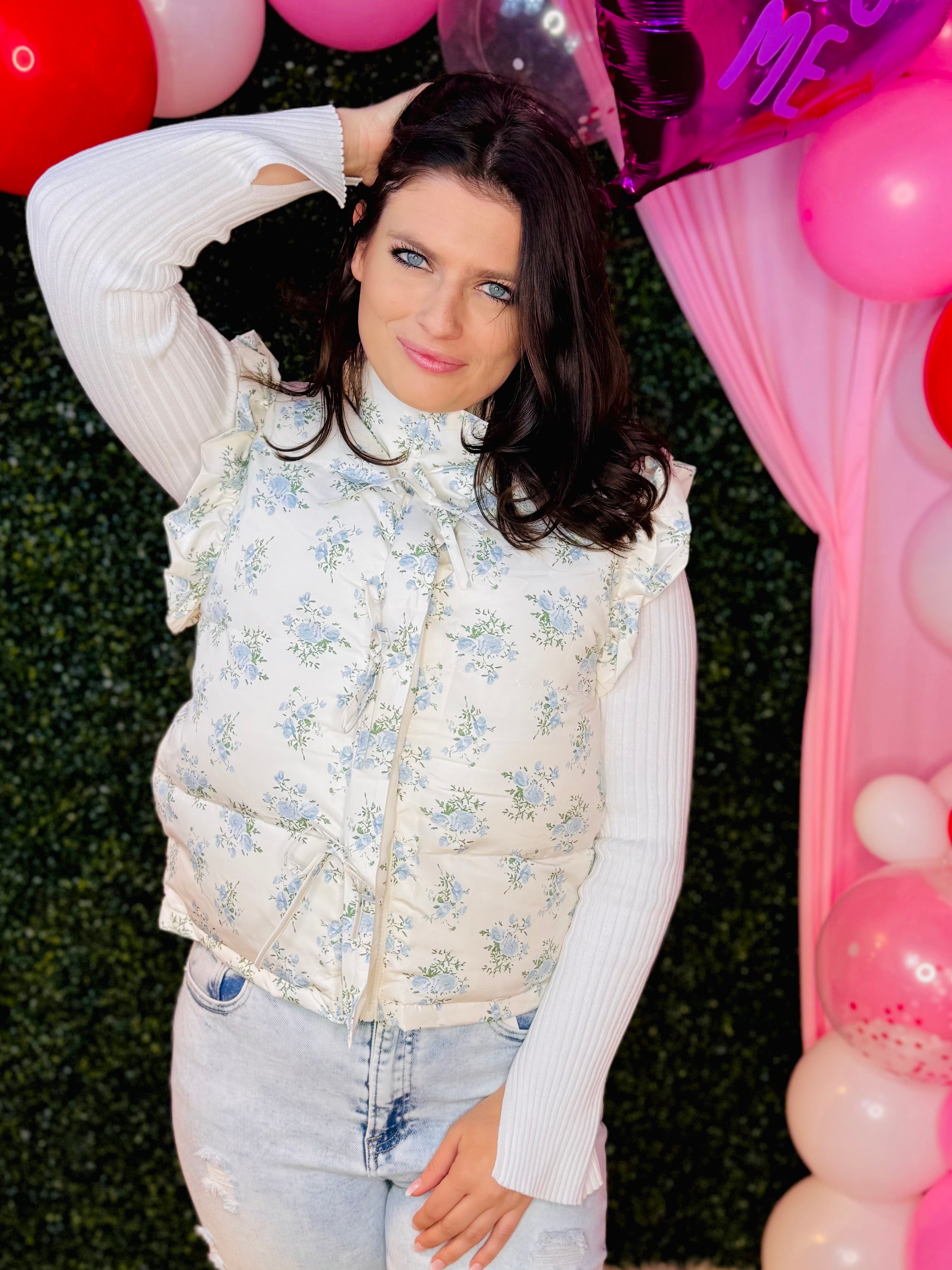 Sweet meets cozy in this front bow puffer vest designed to stand out. Featuring ruffle sleeve details and a charming front bow accent, this vest is available in both floral and solid styles for versatile wear. Complete with a front zipper, side pockets, and a mock neckline, it’s the perfect layering piece to add warmth and feminine flair to any outfit.