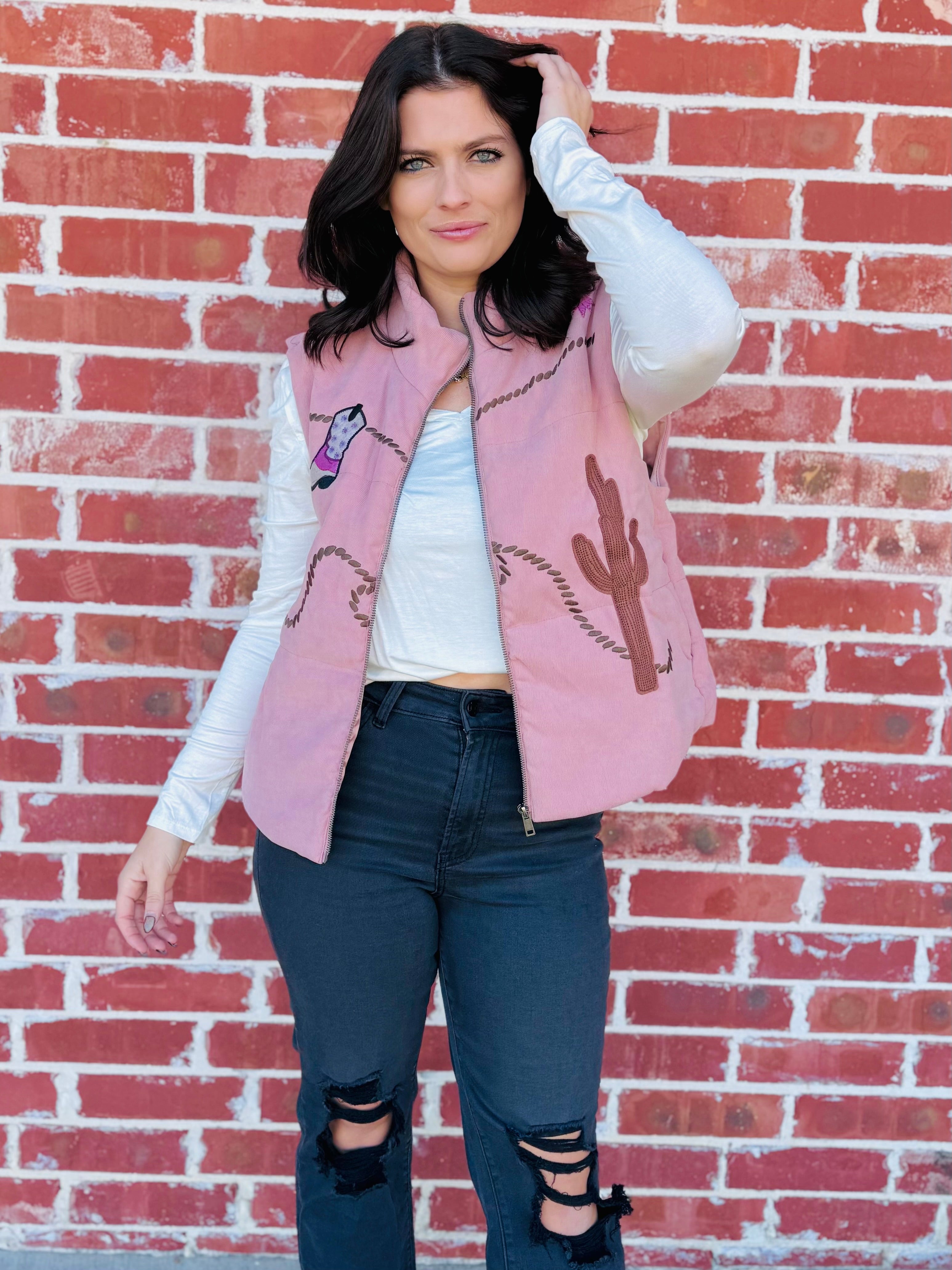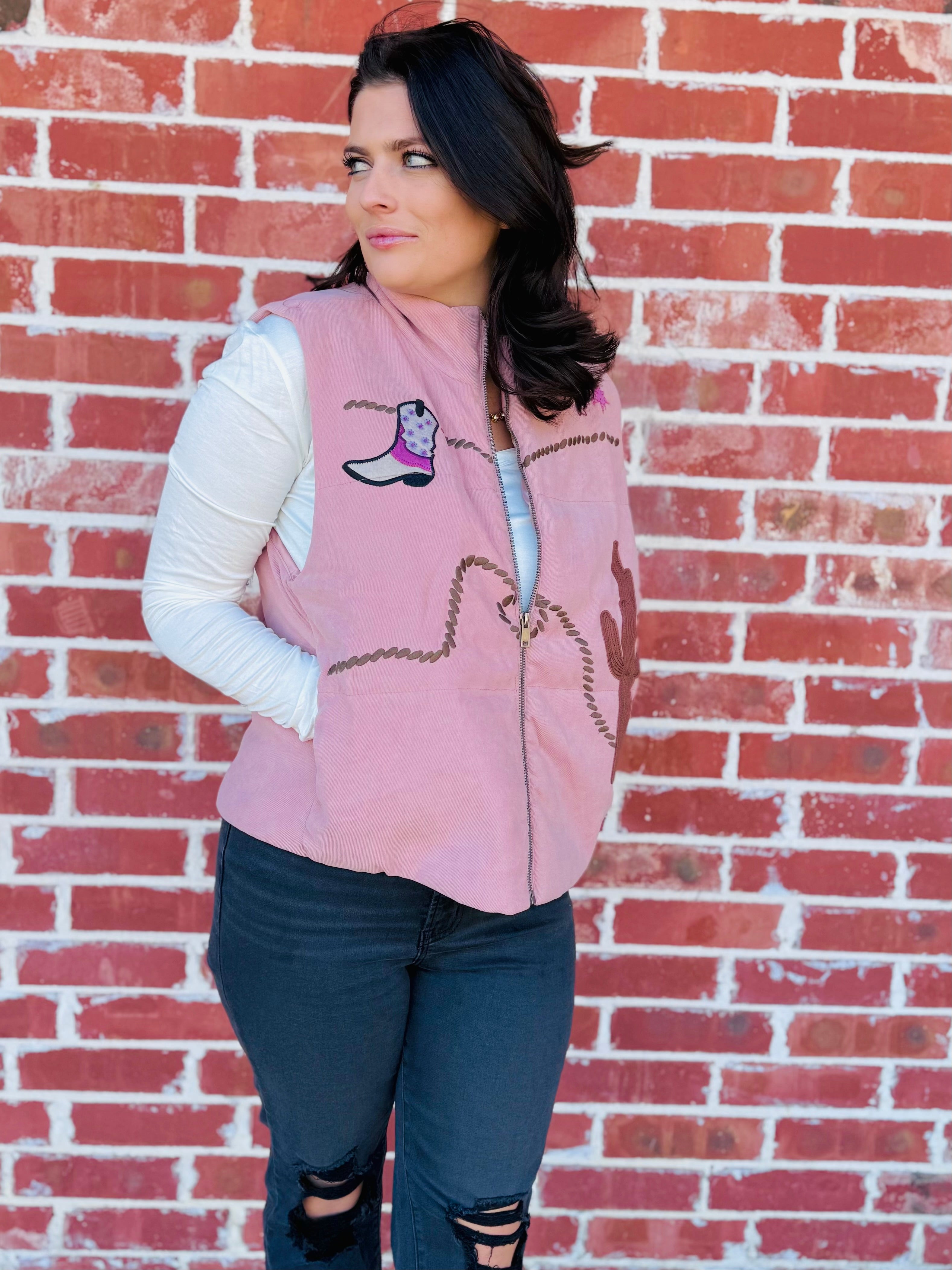 Features: Button-down front, sweater knit body, western-inspired denim accents