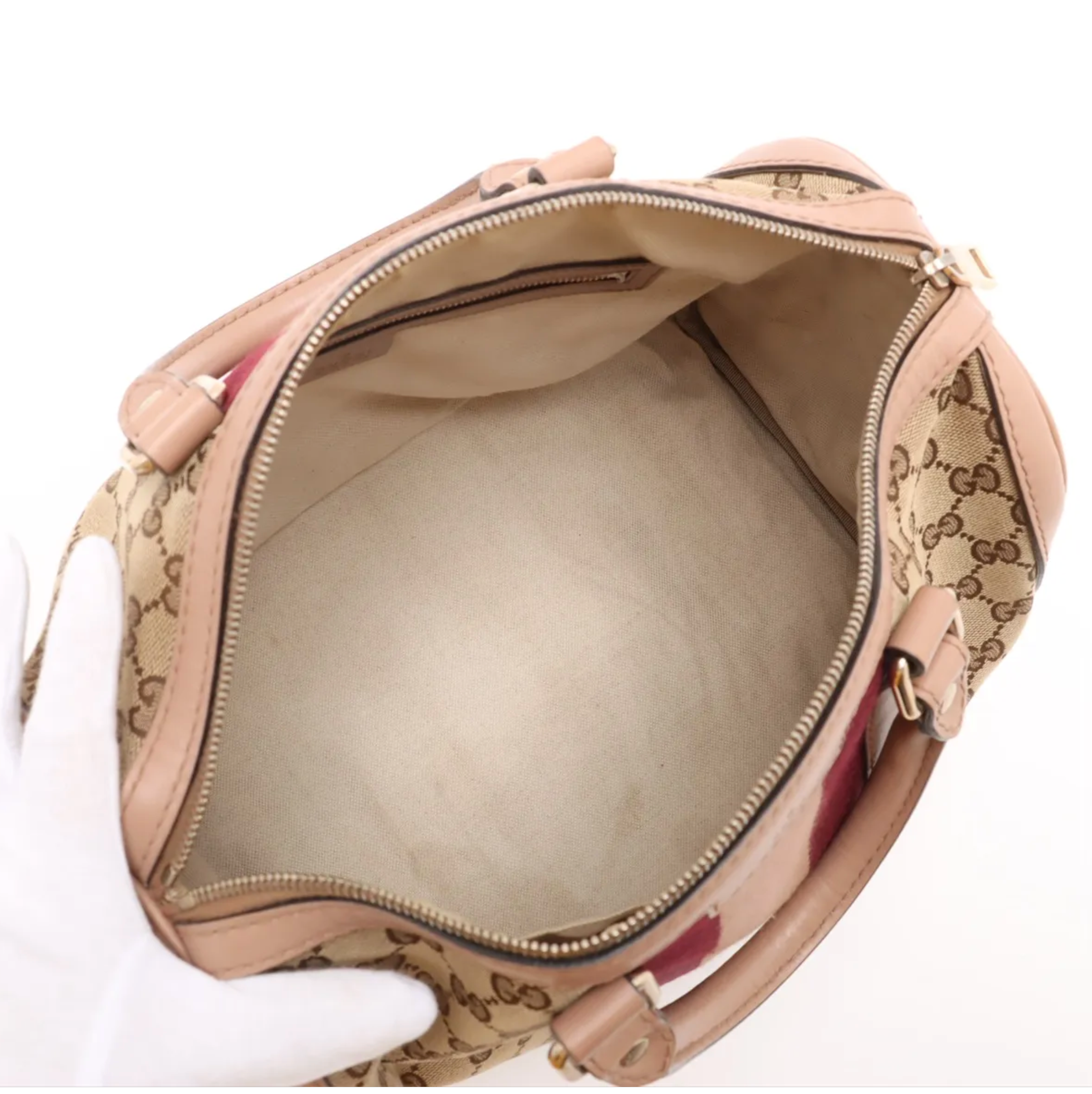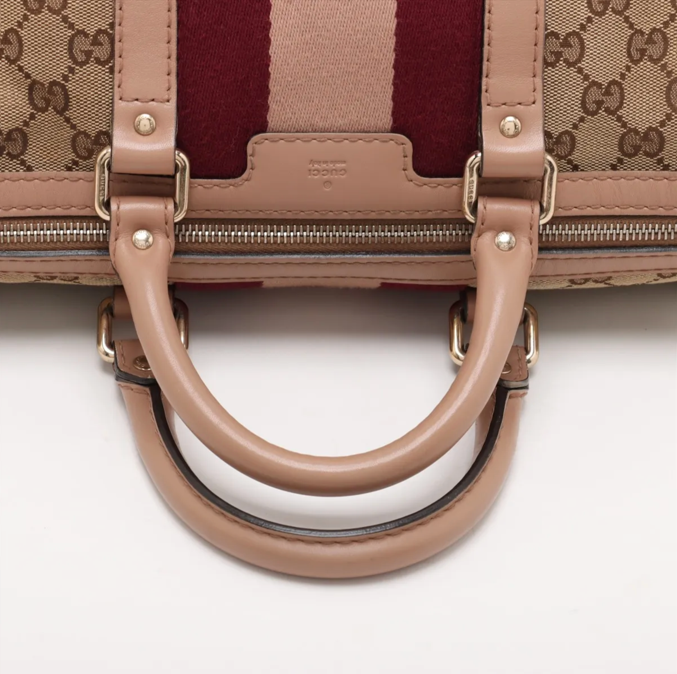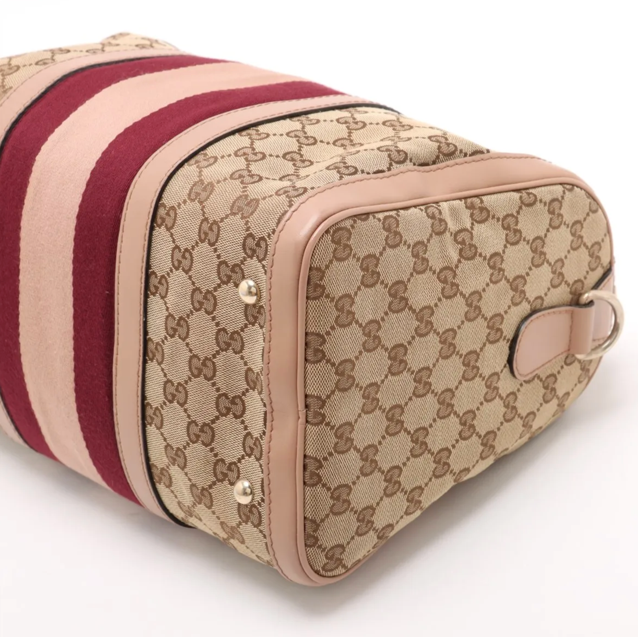 The Gucci GG Logo Canvas Leather Two-Way Shoulder Bag in beige x pink is a stylish and versatile Boston-style bag that blends classic Gucci design with modern functionality. Crafted from durable GG canvas with pink leather accents, it features a spacious interior with both zip and slip pockets for organized storage. The front-to-back maroon-pink-maroon Gucci web stripe adds a bold signature detail, while the top handle and detachable strap offer versatile two-way carry.