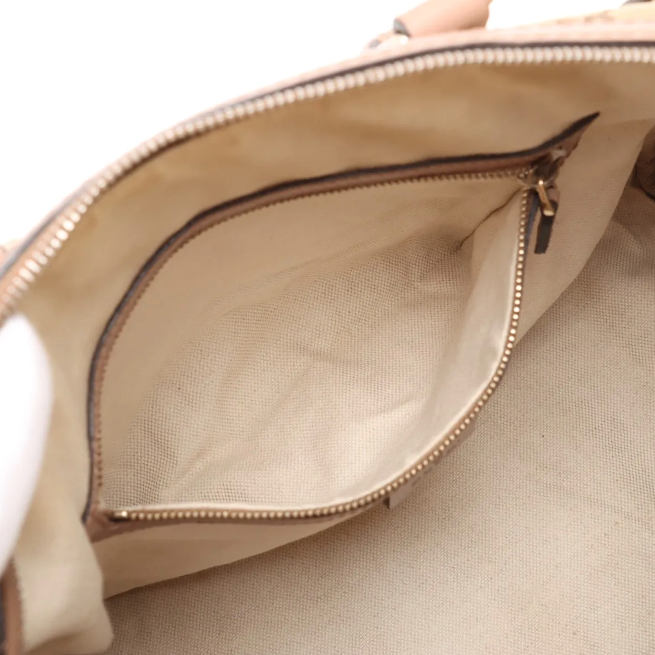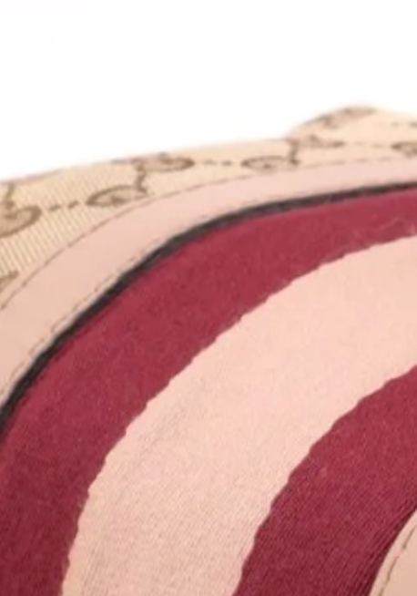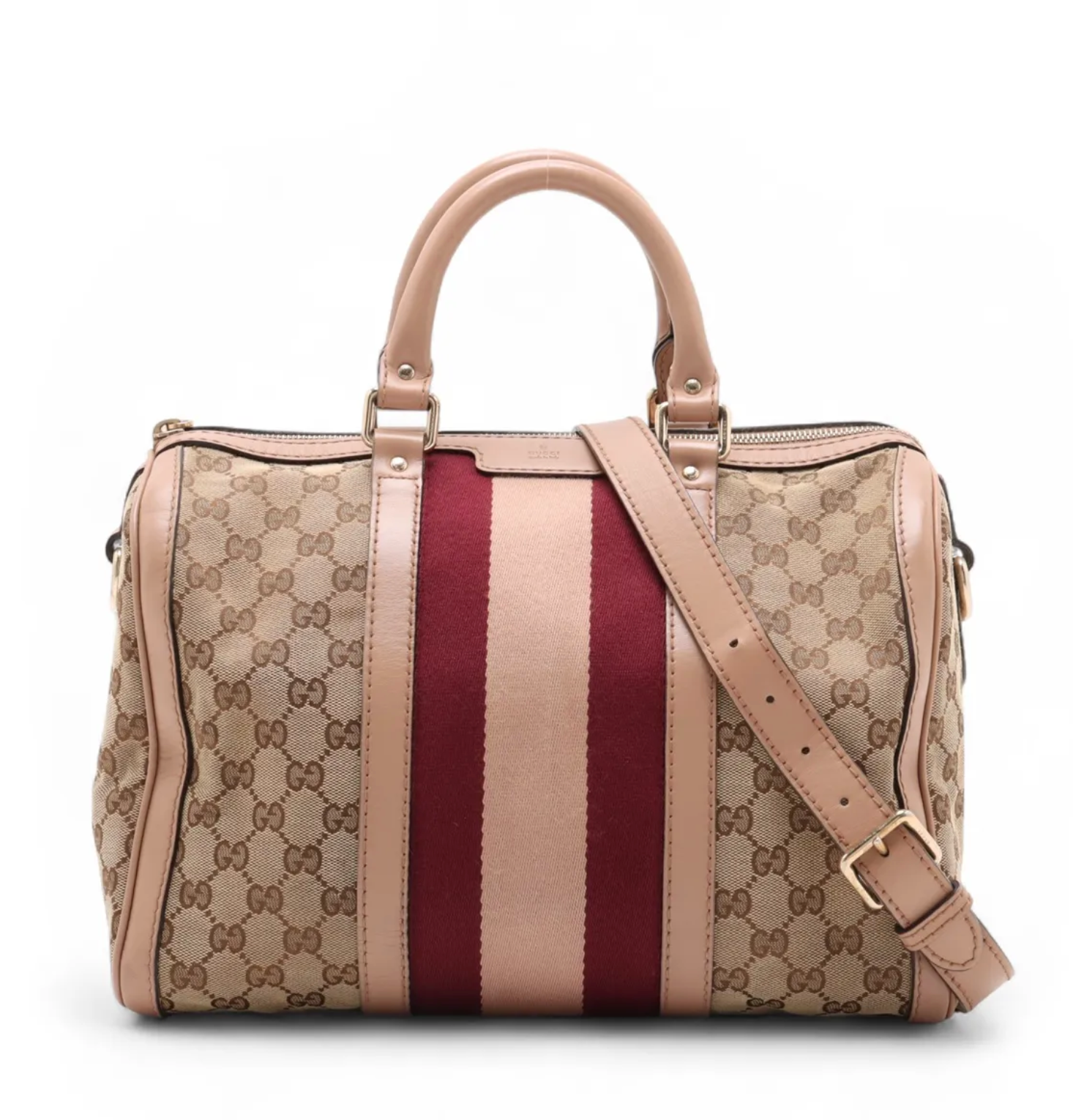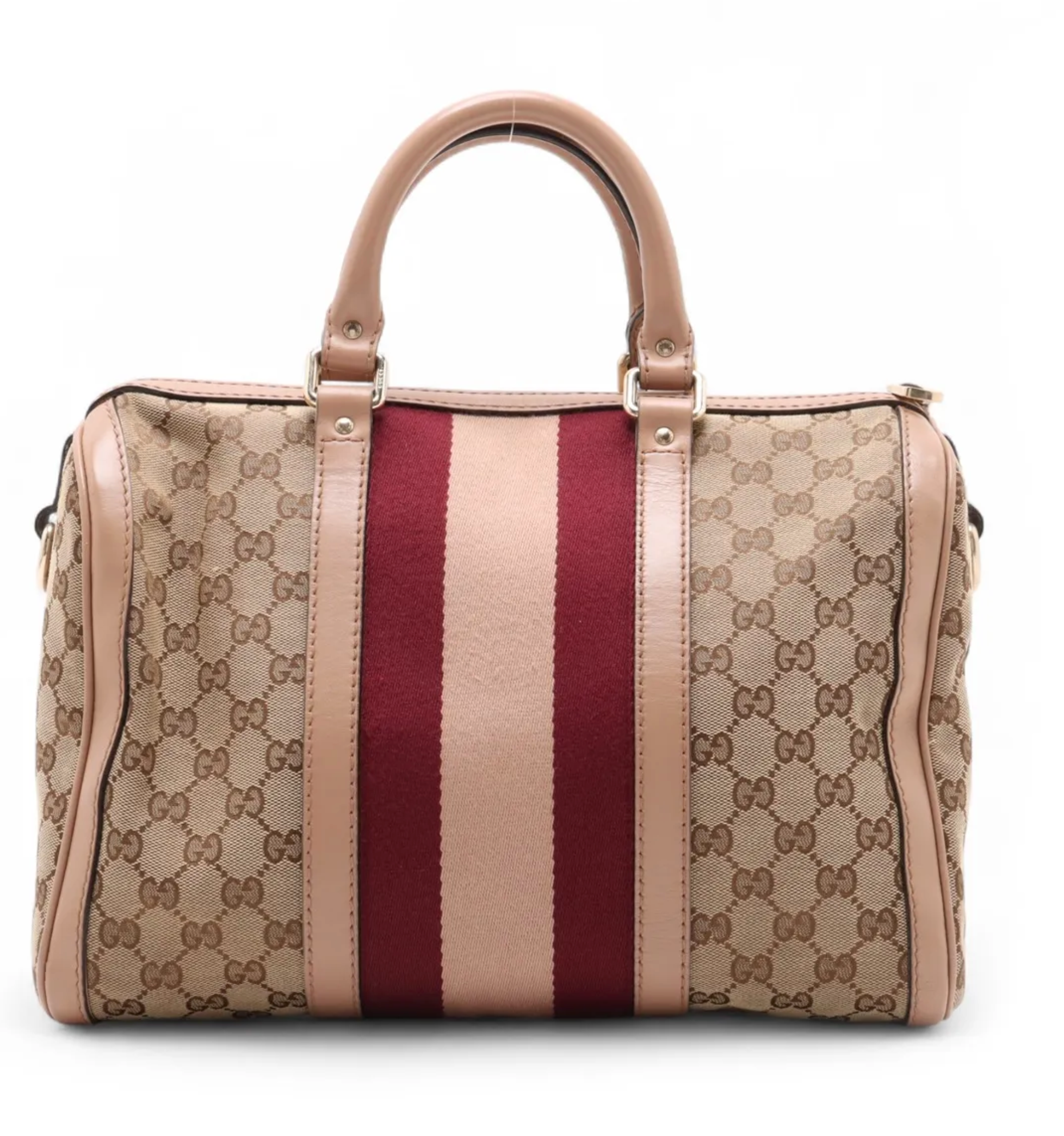 The Gucci GG Logo Canvas Leather Two-Way Shoulder Bag in beige x pink is a stylish and versatile Boston-style bag that blends classic Gucci design with modern functionality. Crafted from durable GG canvas with pink leather accents, it features a spacious interior with both zip and slip pockets for organized storage. The front-to-back maroon-pink-maroon Gucci web stripe adds a bold signature detail, while the top handle and detachable strap offer versatile two-way carry.