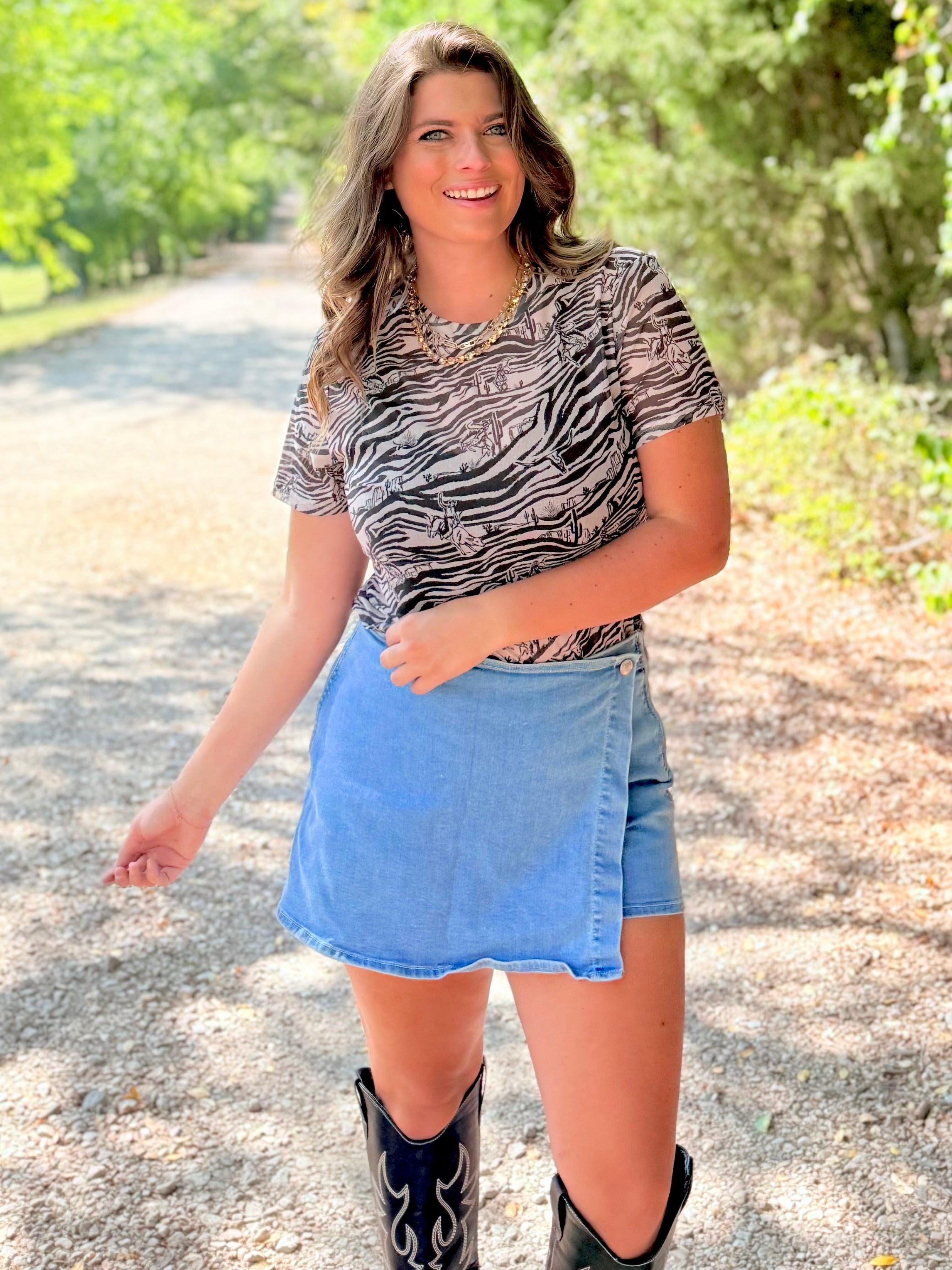 this has been HOT pattern and we are obsessed.you know the drill it's our normal mesh with a really RAD western zebra pattern.layer it or wear it as is. she won't disappoint.mesh short-sleeve.western zebra pattern.lots of stretch.