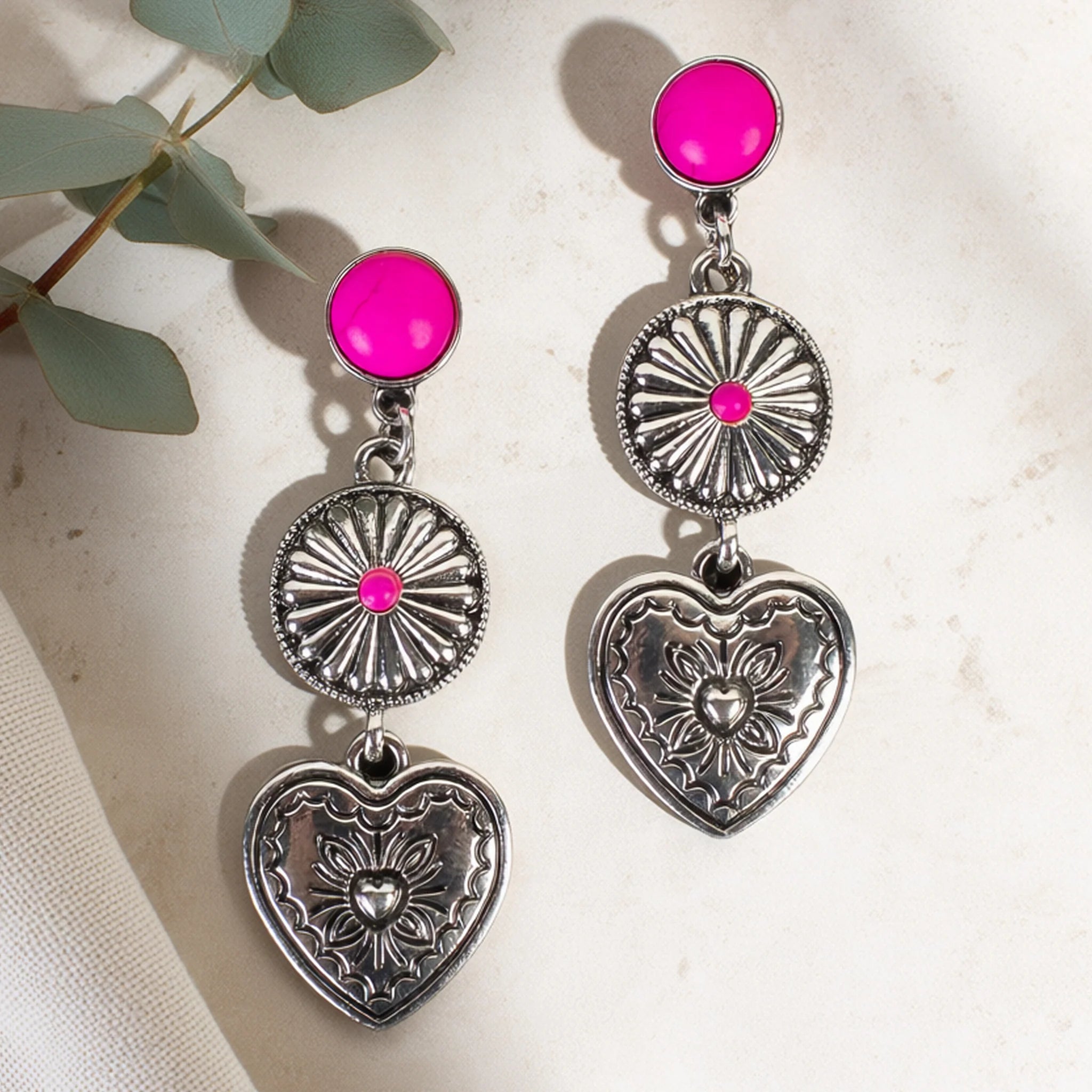 Perfect for girls’ nights out, country concerts, rodeo outfits, Valentine’s looks, and boutique fashion, these earrings are ideal if you're searching for fuchsia statement earrings, heart dangle earrings, western jewelry, or bold boutique accessories.