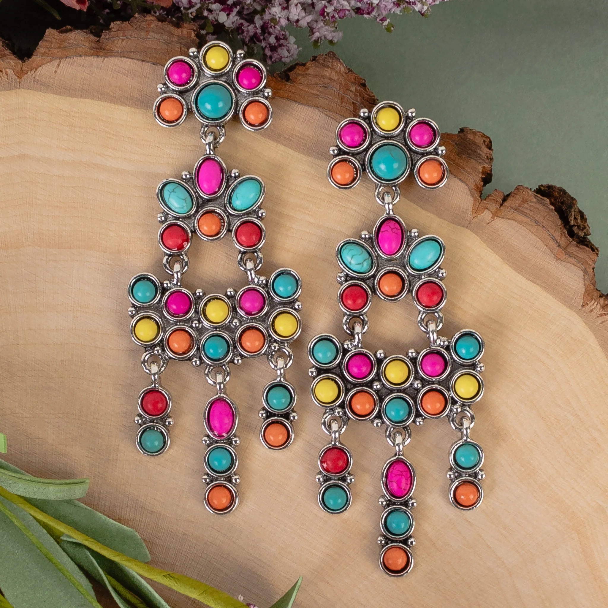 Perfect for rodeo outfits, country concerts, festivals, vacations, and everyday boutique fashion, these earrings are ideal if you're searching for multi-color squash blossom earrings, western statement earrings, colorful jewelry, or boho accessories.