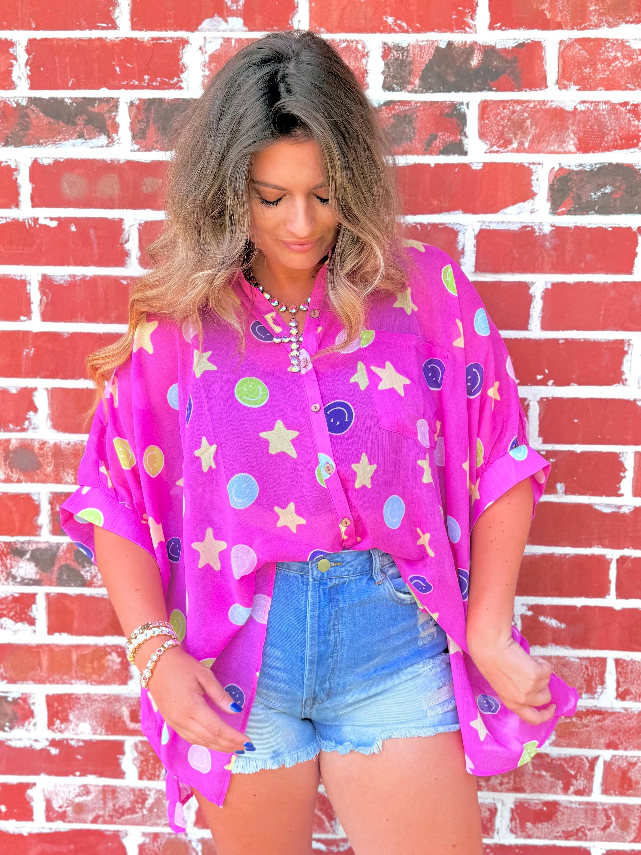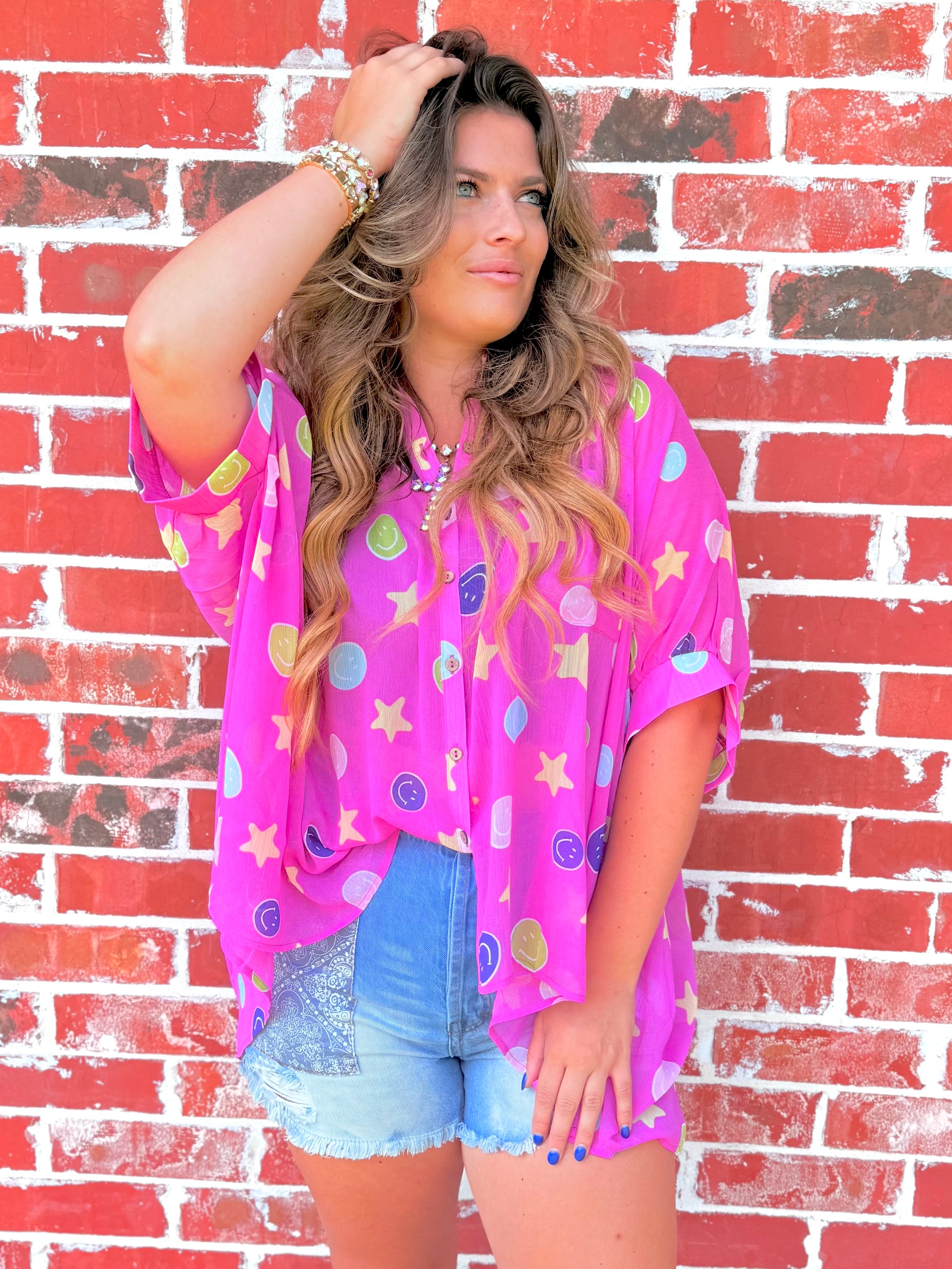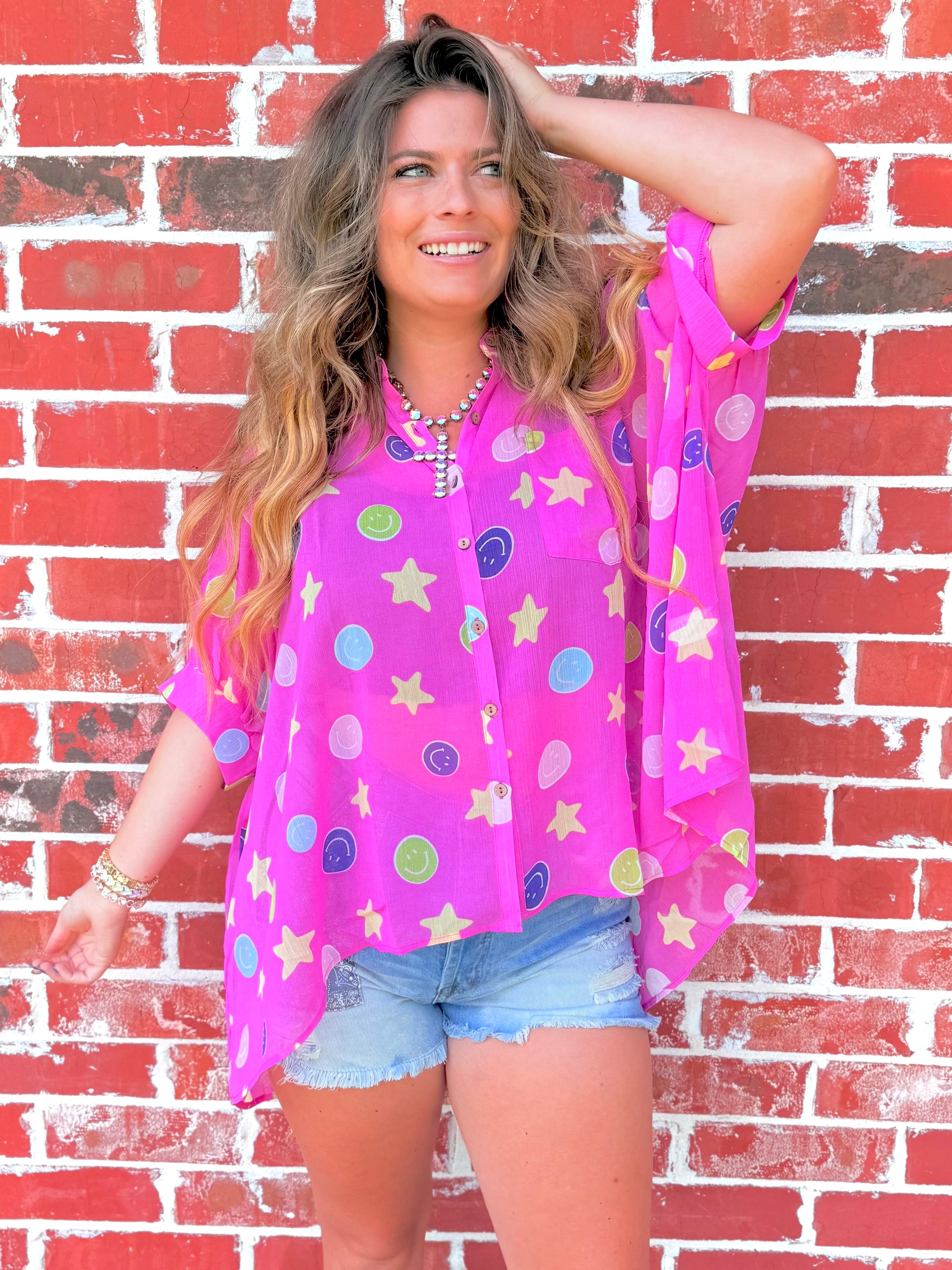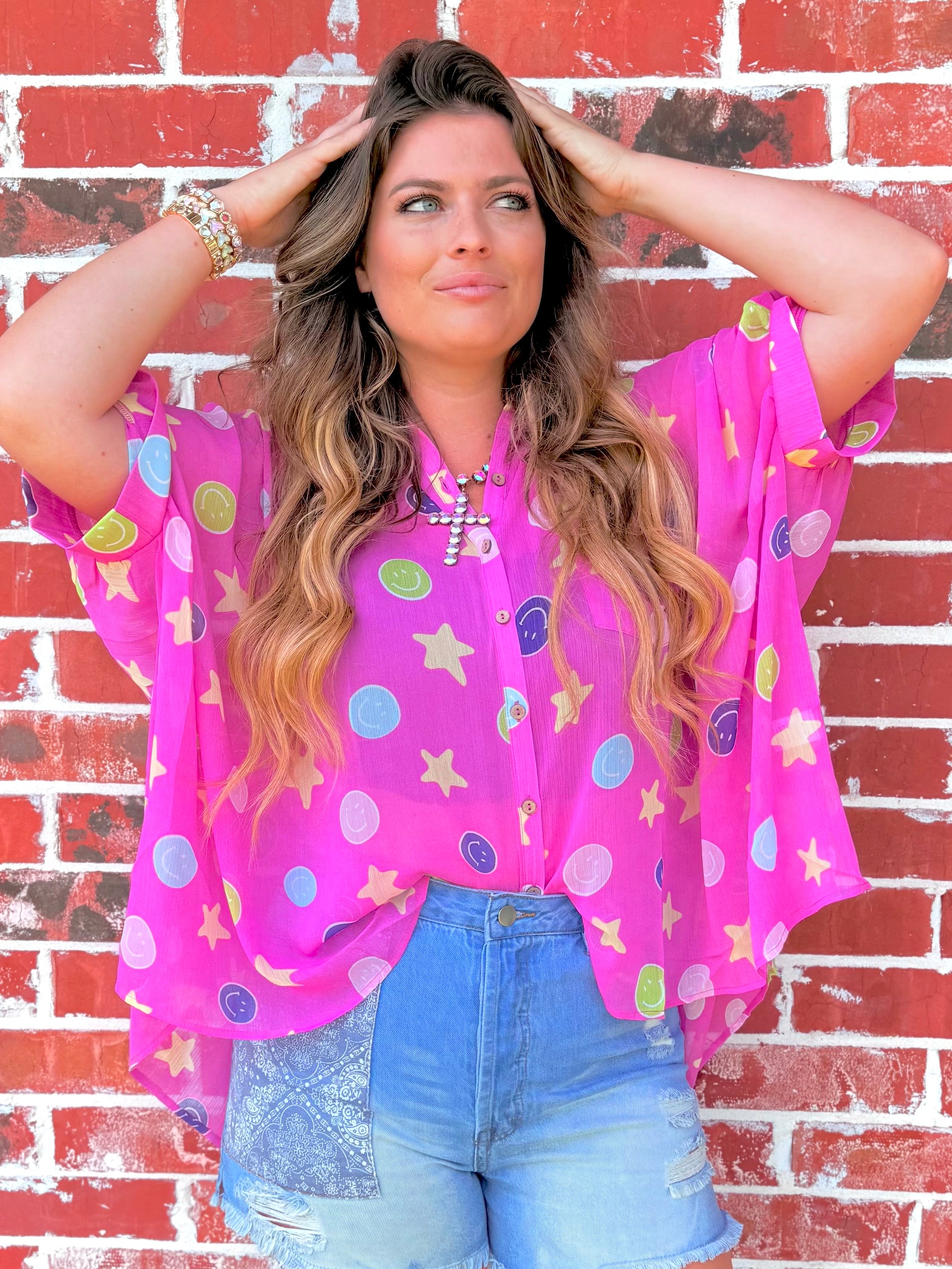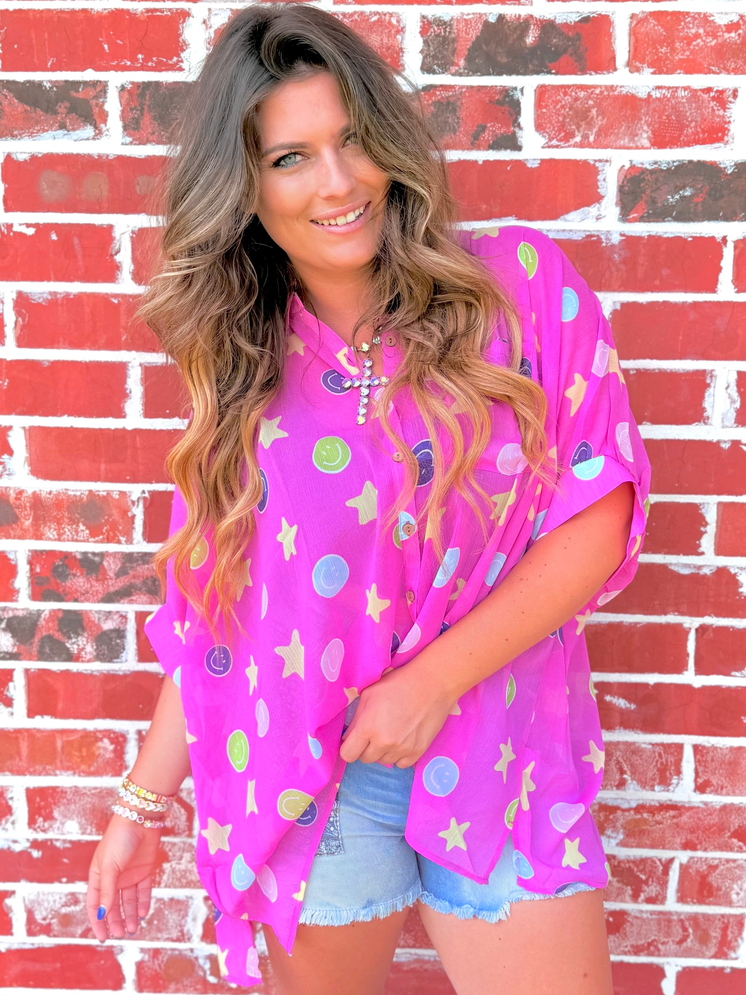 Spread sunshine in style with the Happy Vibes Oversized Shirt — the ultimate mood-boosting layer for laid-back days and playful outfits. This sheer chiffon button-down features a joyful mix of smiley face and star prints, wrapped in a relaxed silhouette you’ll love to live in.