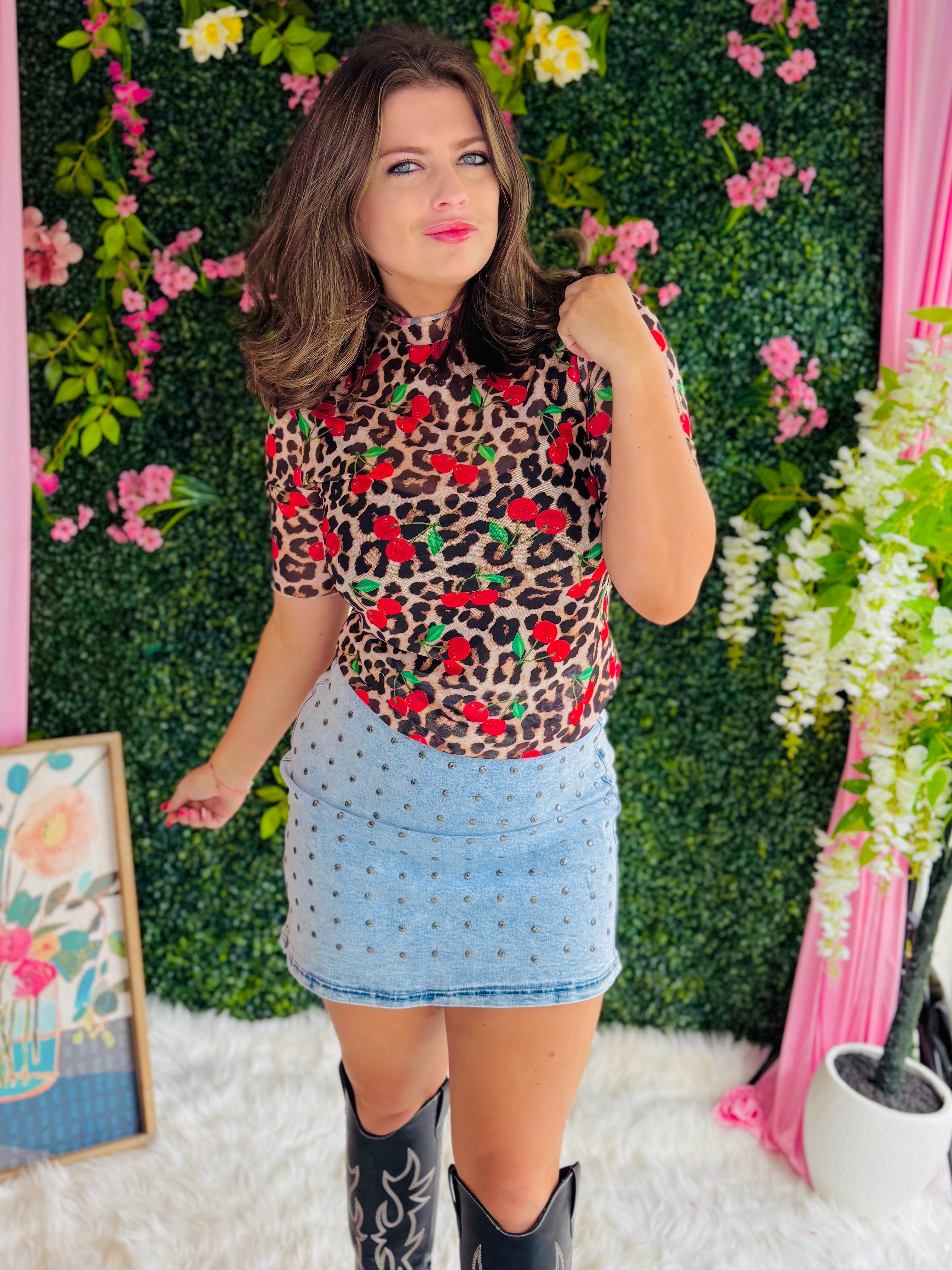 Get ready to make a bold statement in our Kora Short Sleeve Mesh Top! This playful top is a spin on our classic Keigan Mesh with short sleeves. Featuring lettuce hems, a mock neckline, a fun & chic leopard print with cherry accents, and a sheer mesh material that can be layered under or over any outfit. Don't miss out on this must have piece!