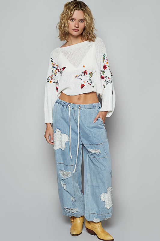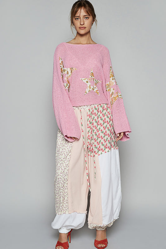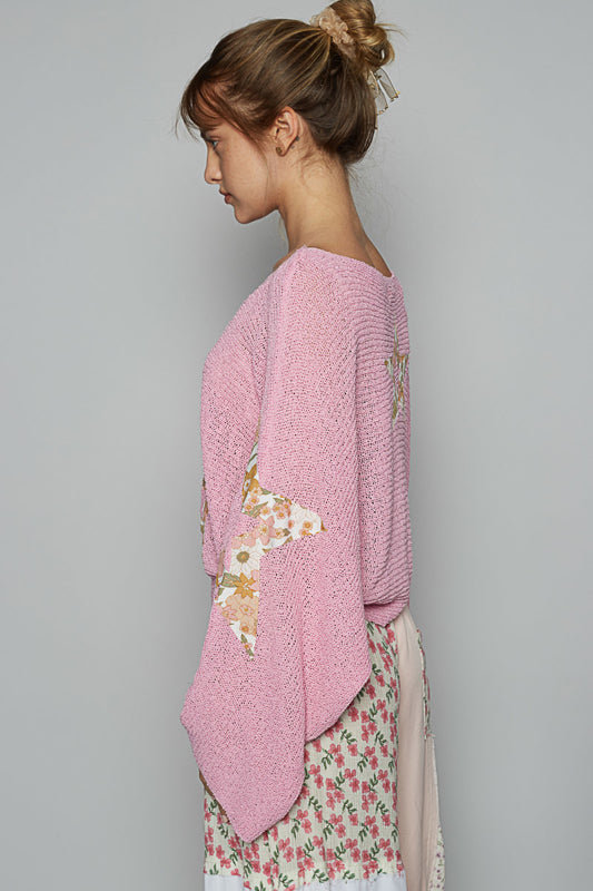 Floral Print French Terry Top with Lace Sleeves