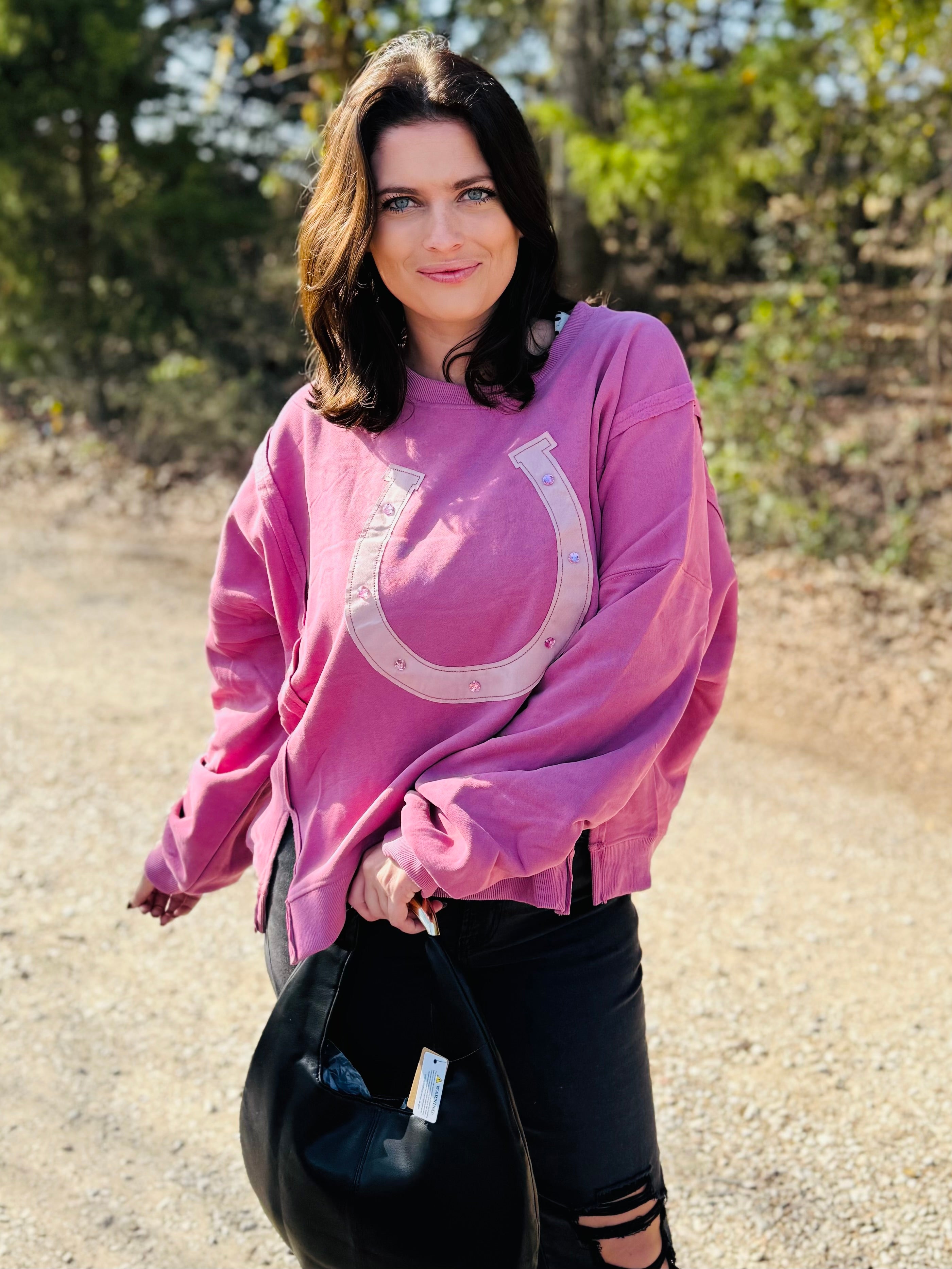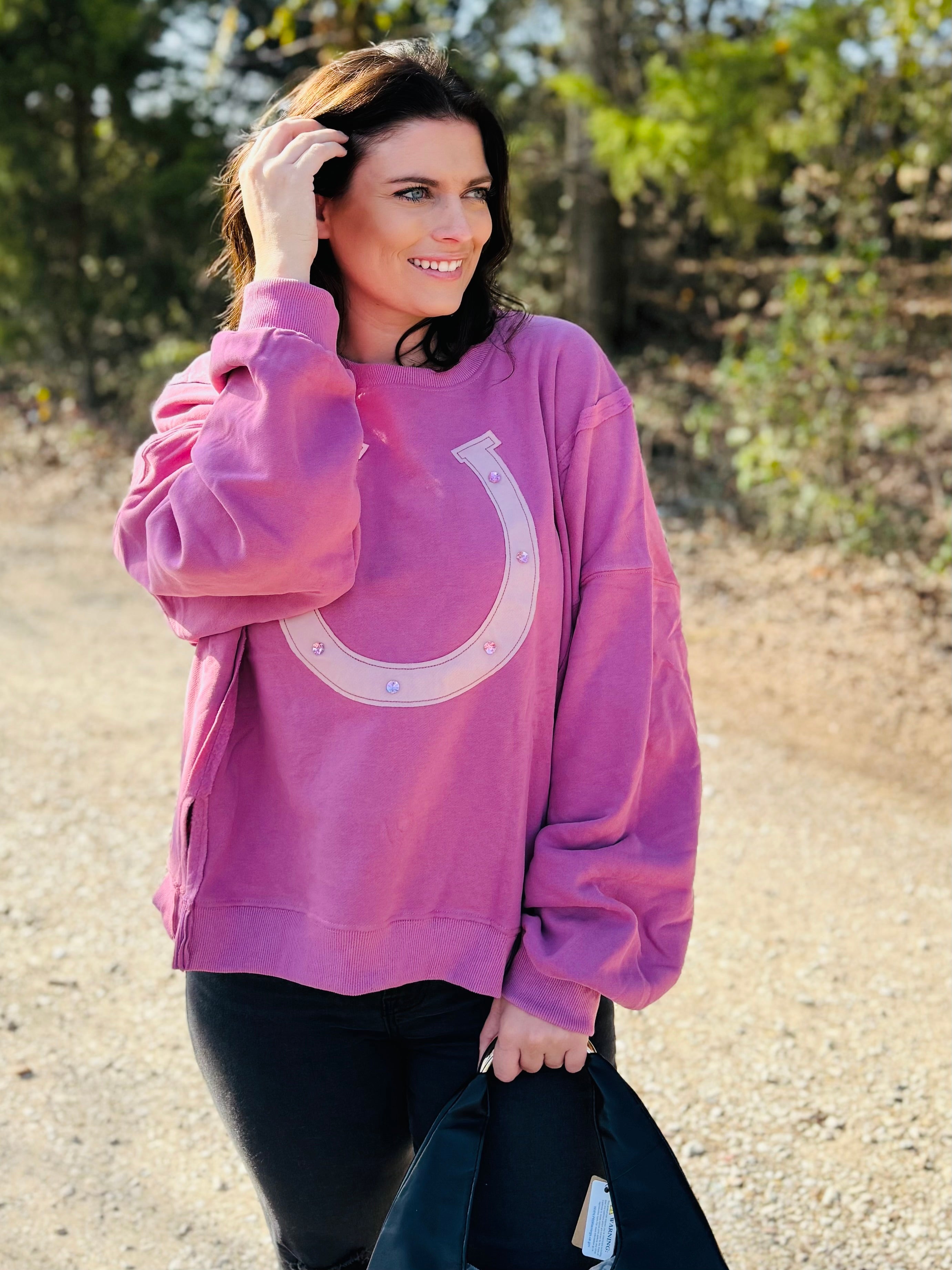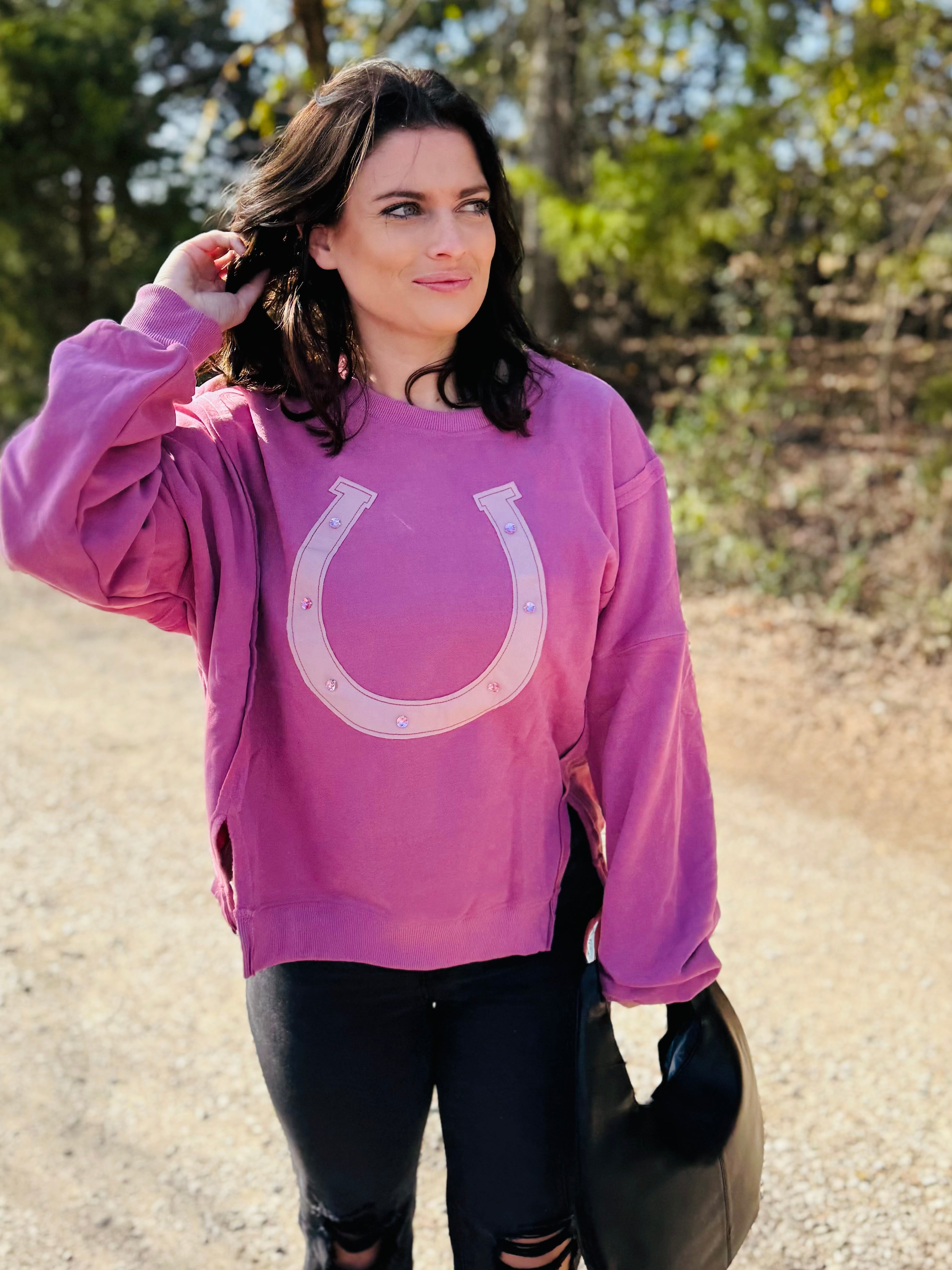 This long sleeve sweatshirt features a bold horseshoe design with contrast detailing for a subtle western-inspired touch. Crafted from a soft, cozy fabric in a pretty pink hue, it offers a relaxed fit with a flattering boat neckline that elevates the classic sweatshirt silhouette. Easy, comfy, and stylish, it’s perfect for everyday wear with denim or leggings.