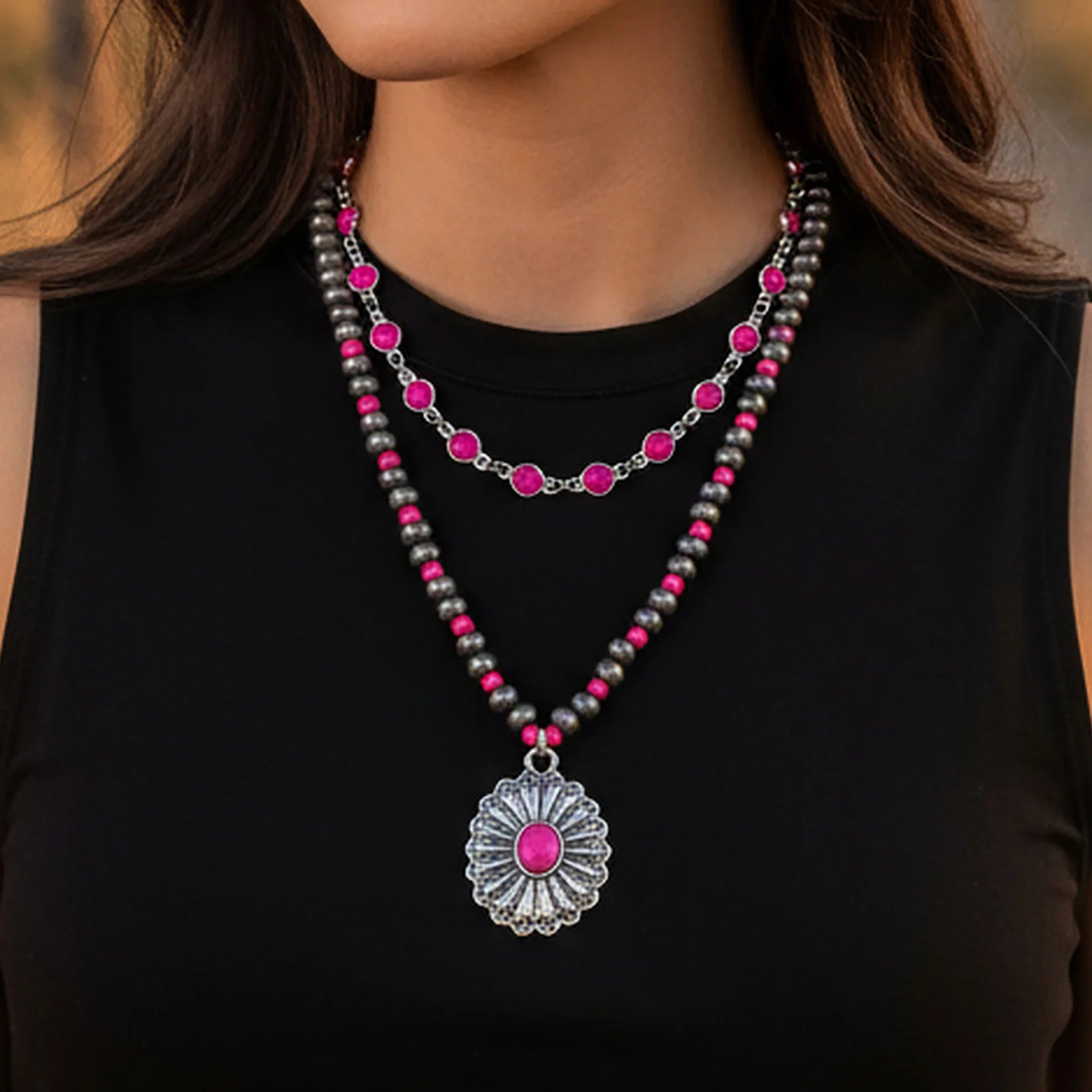 Perfect for rodeo outfits, country concerts, festivals, vacations, and everyday western fashion, this necklace is ideal if you're searching for layered squash blossom necklaces, western statement jewelry, bold layered necklaces, or boho accessories.