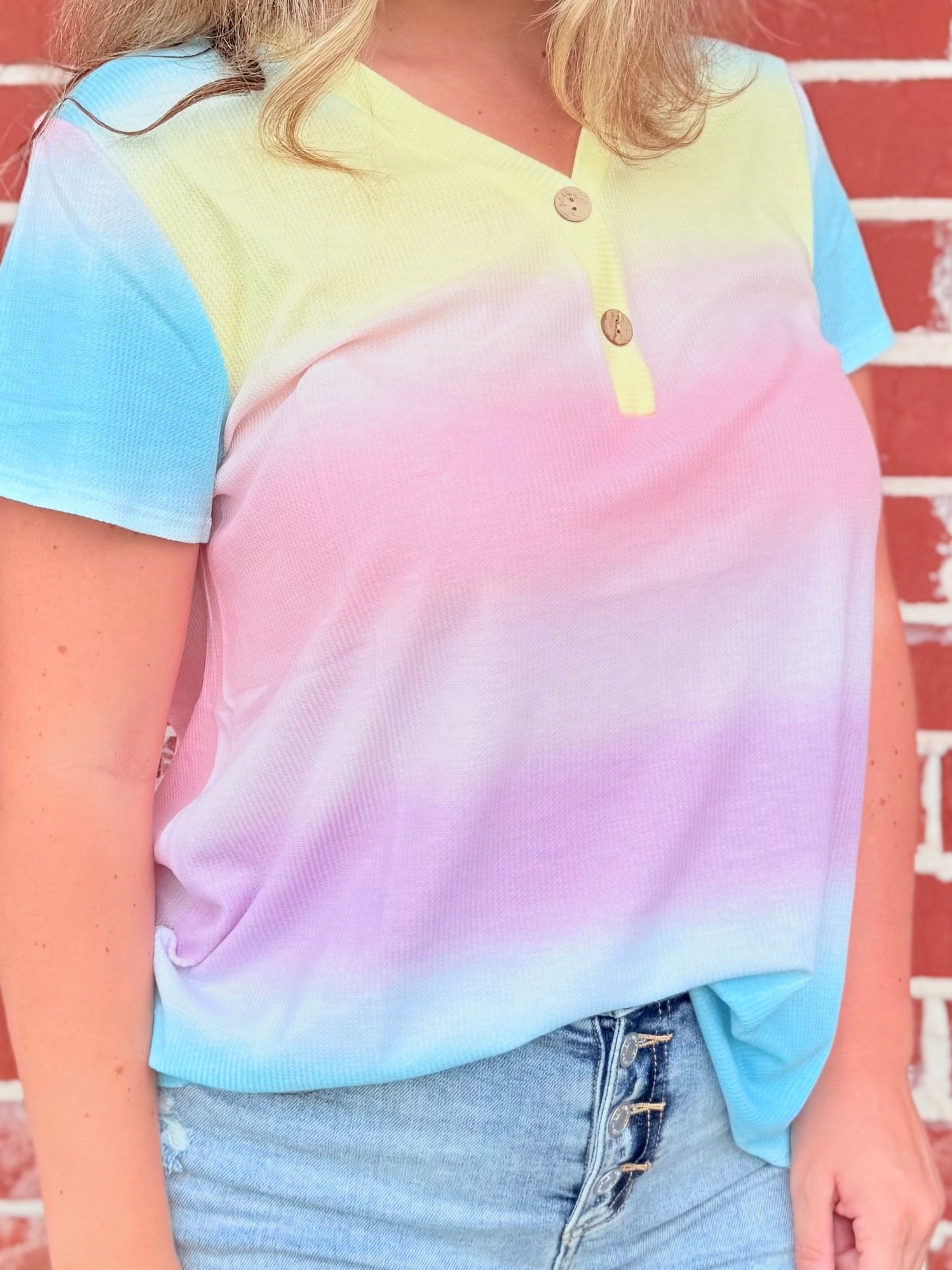 Unleash your inner rainbow with the vibrant and playful Chasing Rainbows Top. This top is designed to bring joy, positivity and color to your wardrobe, making every day feel like a celebration.