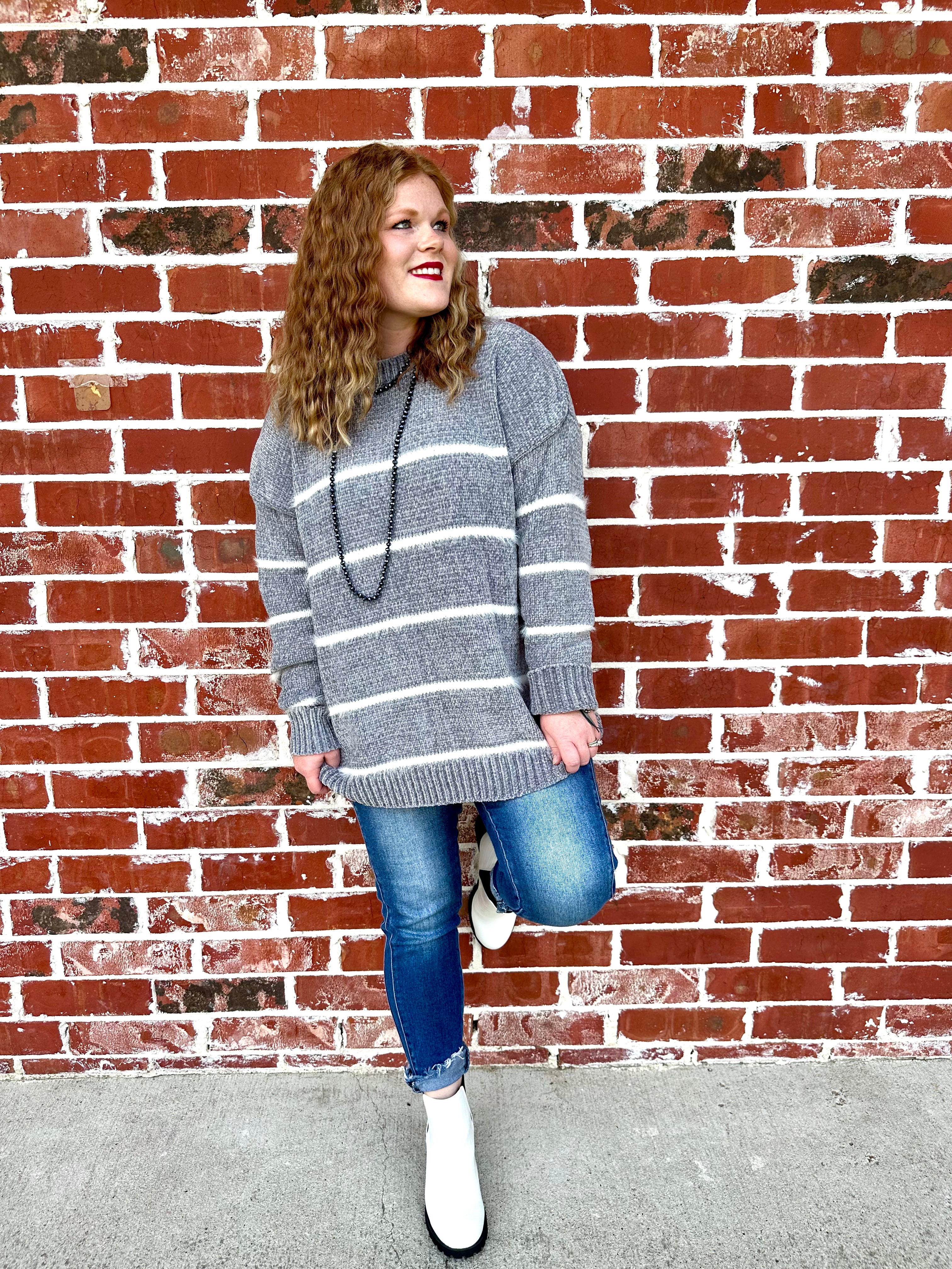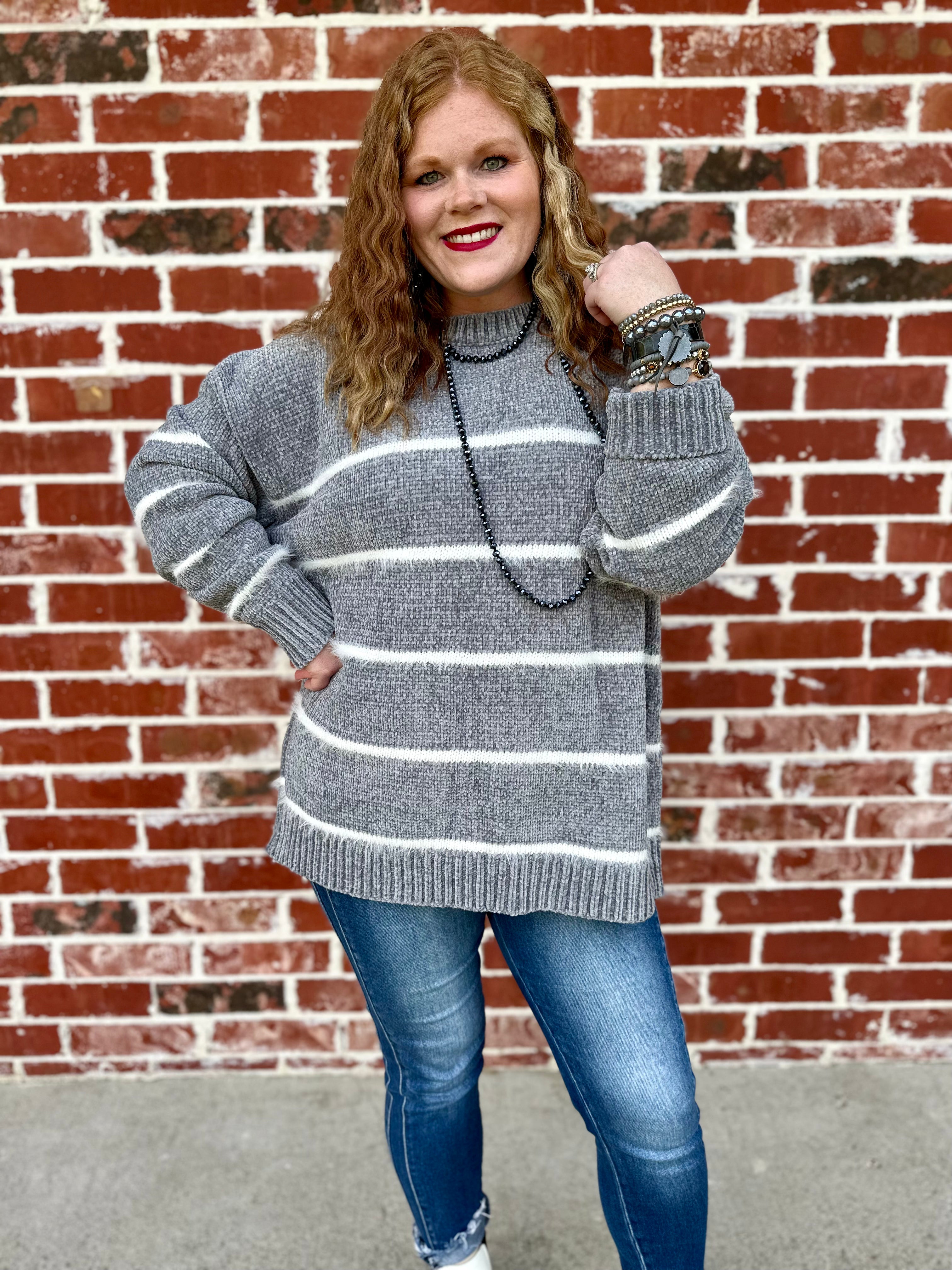 Stay comfortable and stylish with our It's Just Casual Stripe Sweater in Grey! This versatile sweater features trendy stripes and a soft fabric, perfect for any casual occasion. Elevate your wardrobe with this must-have piece and effortlessly elevate your style.