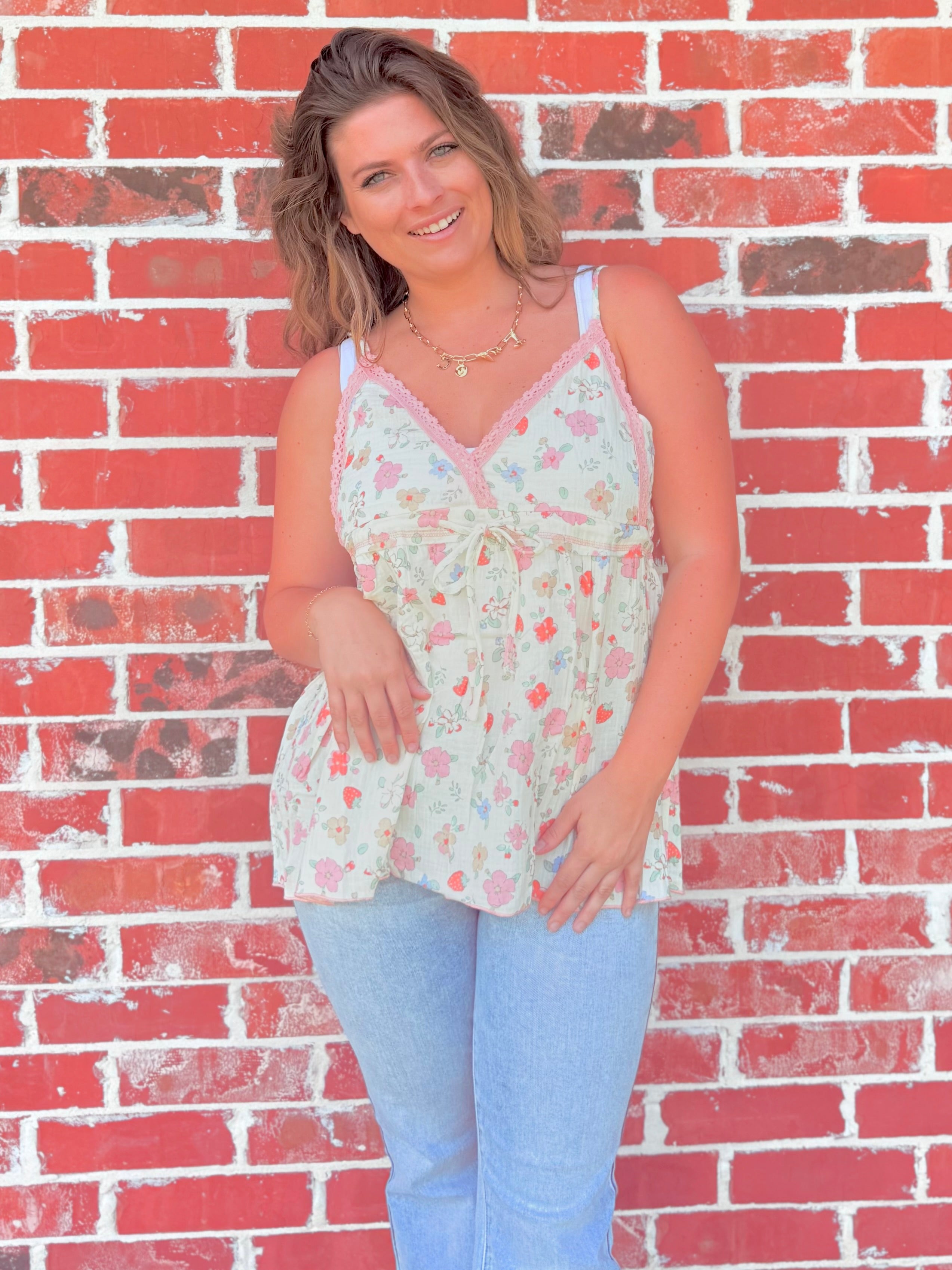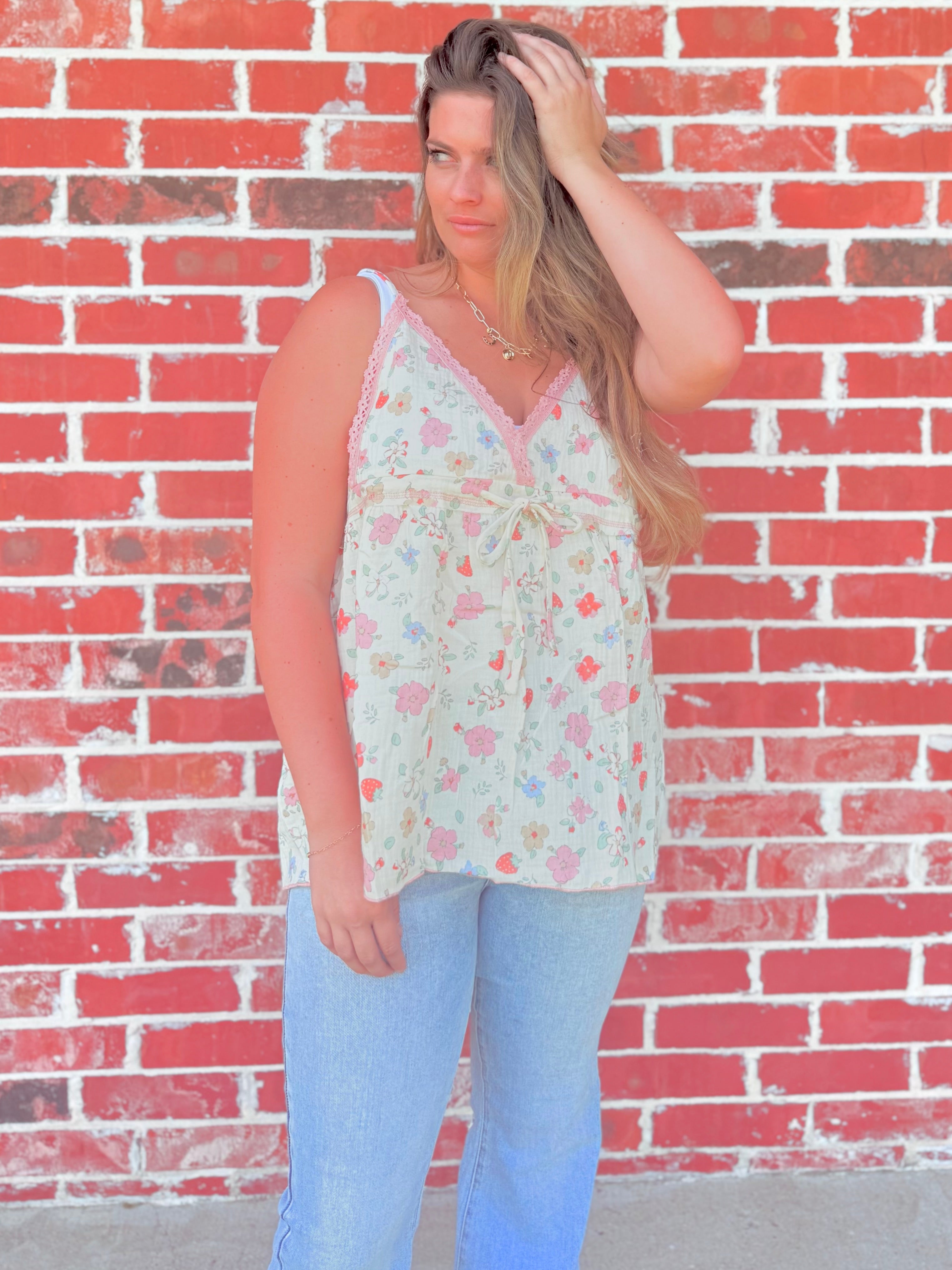 Breezy, boho, and made for sunshine days. This sleeveless V-neck top is crafted from soft printed double gauze with vintage washing for that lived-in charm. Featuring delicate trim points, overlock stitching, merrow edge detailing, and a cinched waist with adjustable spaghetti ties—this piece flatters effortlessly while giving off romantic, free-spirited energy.