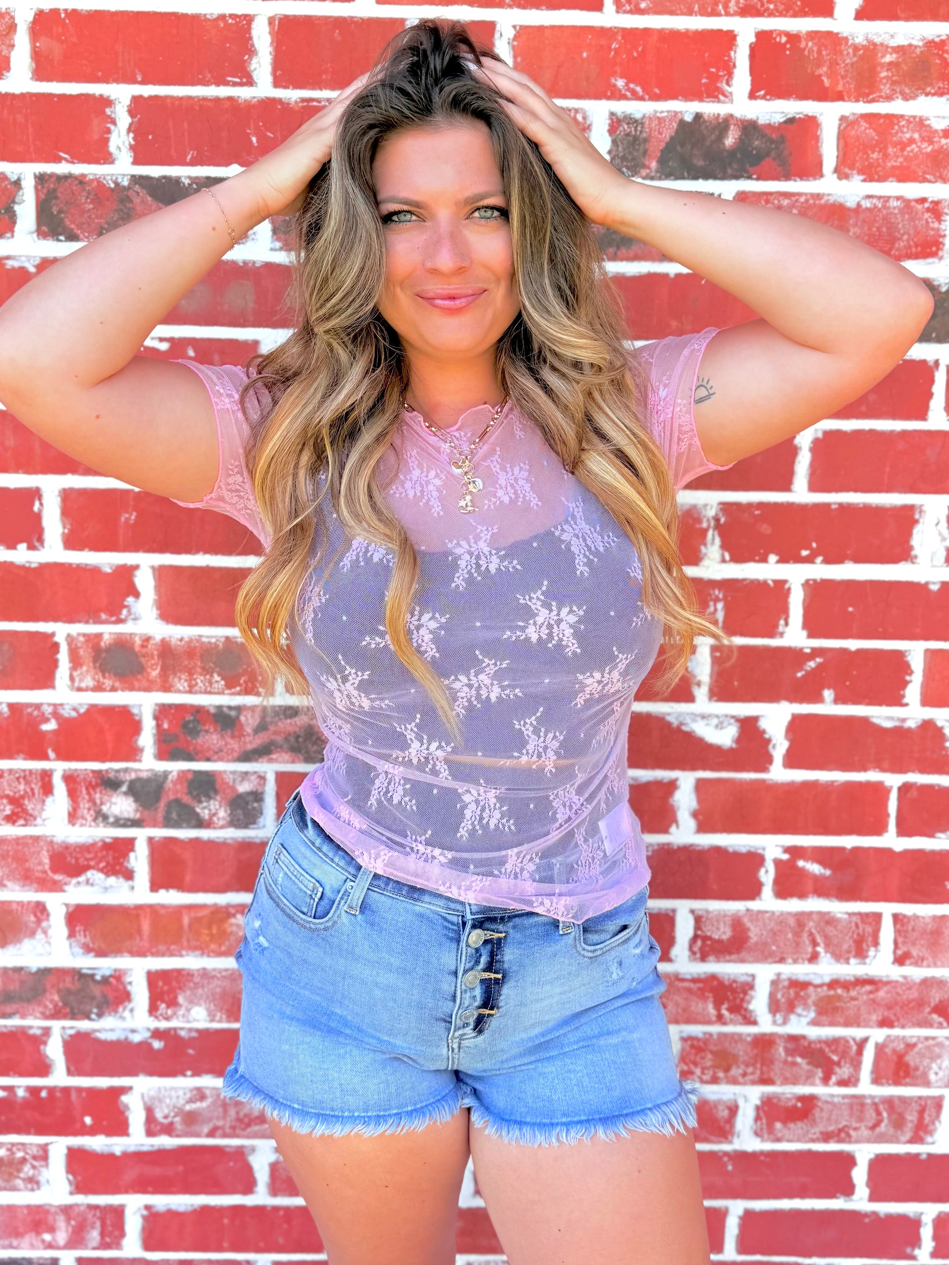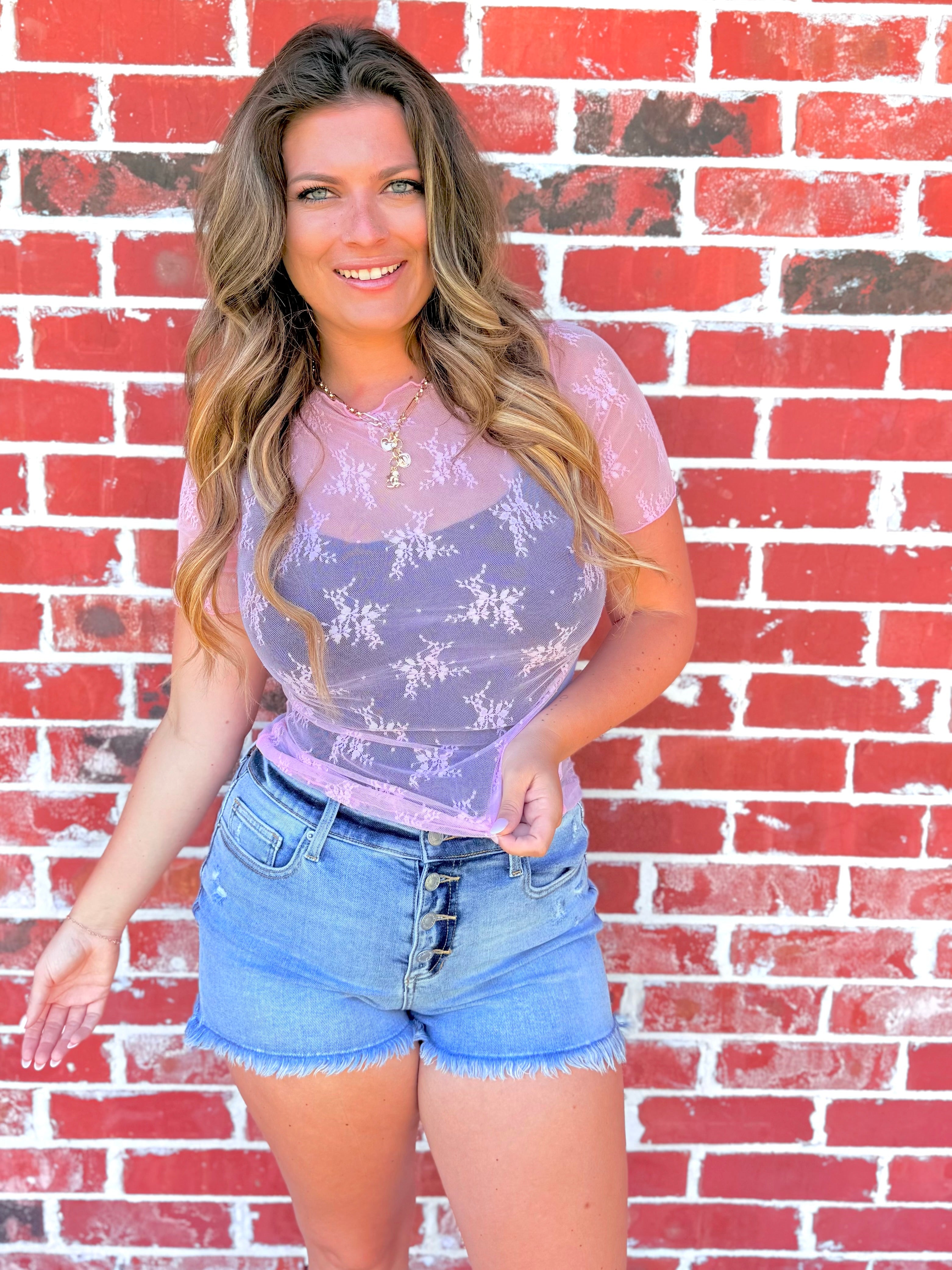 HIGH NECKLINE MESH LACE SHORT SLEEVES TOP