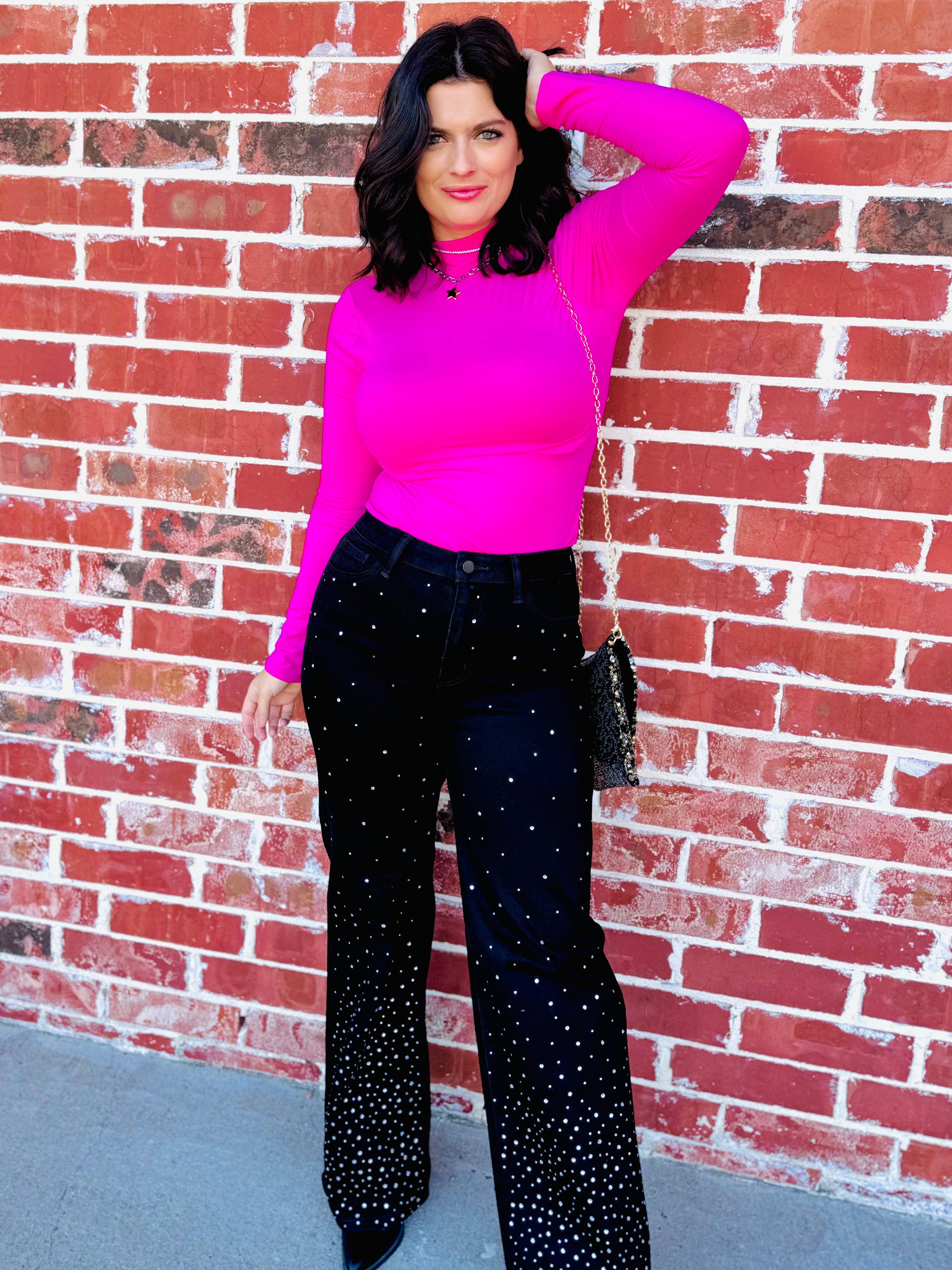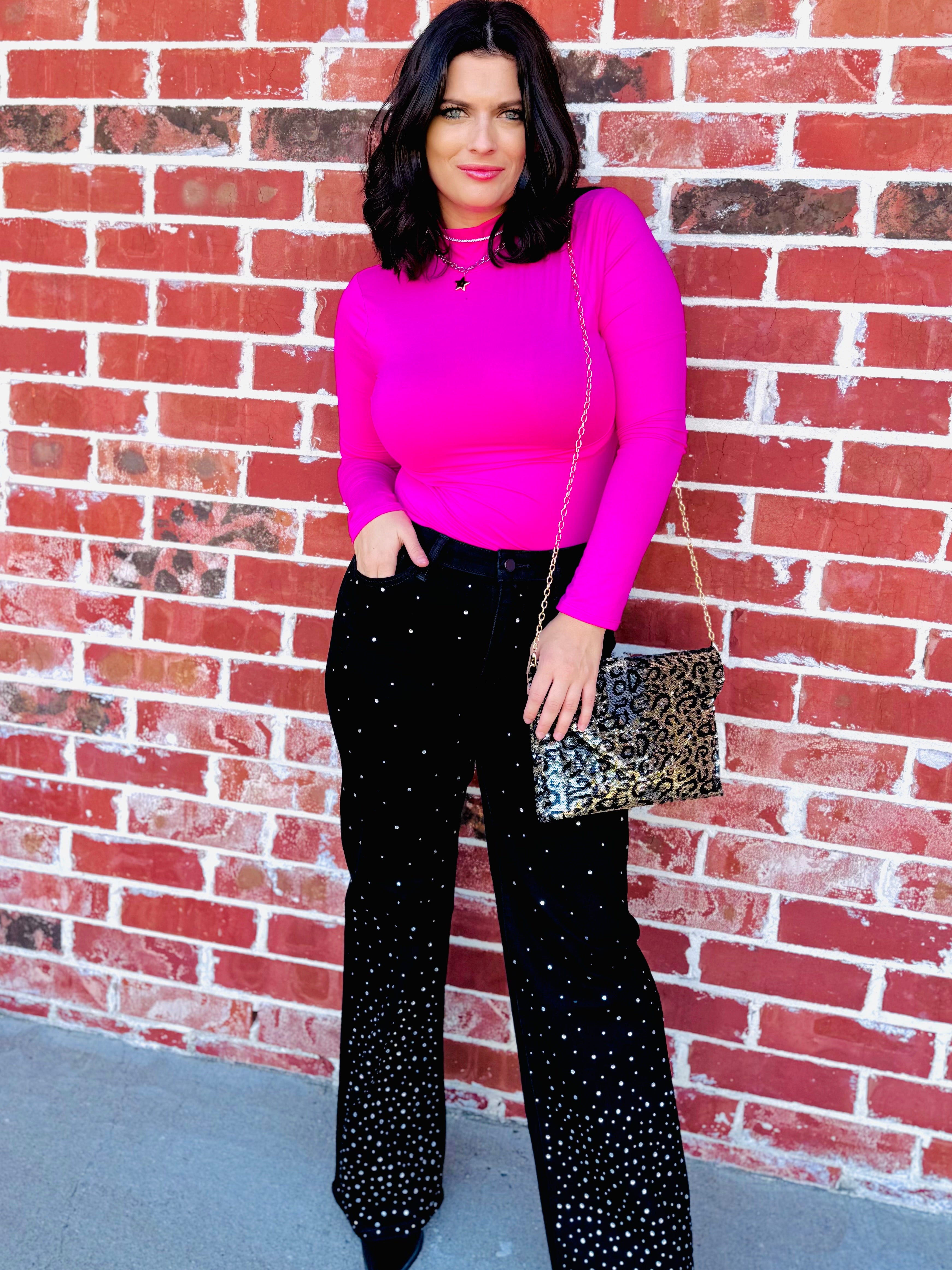 Shine bright, babe ✨ These high-rise wide leg jeans bring all the glam with their dazzling front rhinestone embellishments that catch the light just right 💫 Made from comfort stretch denim, they hug your waist while giving you that effortless, relaxed drape through the leg. The finished hem and full-length cut make them perfect for pairing with heels or booties for a look that’s totally show-stopping 💃