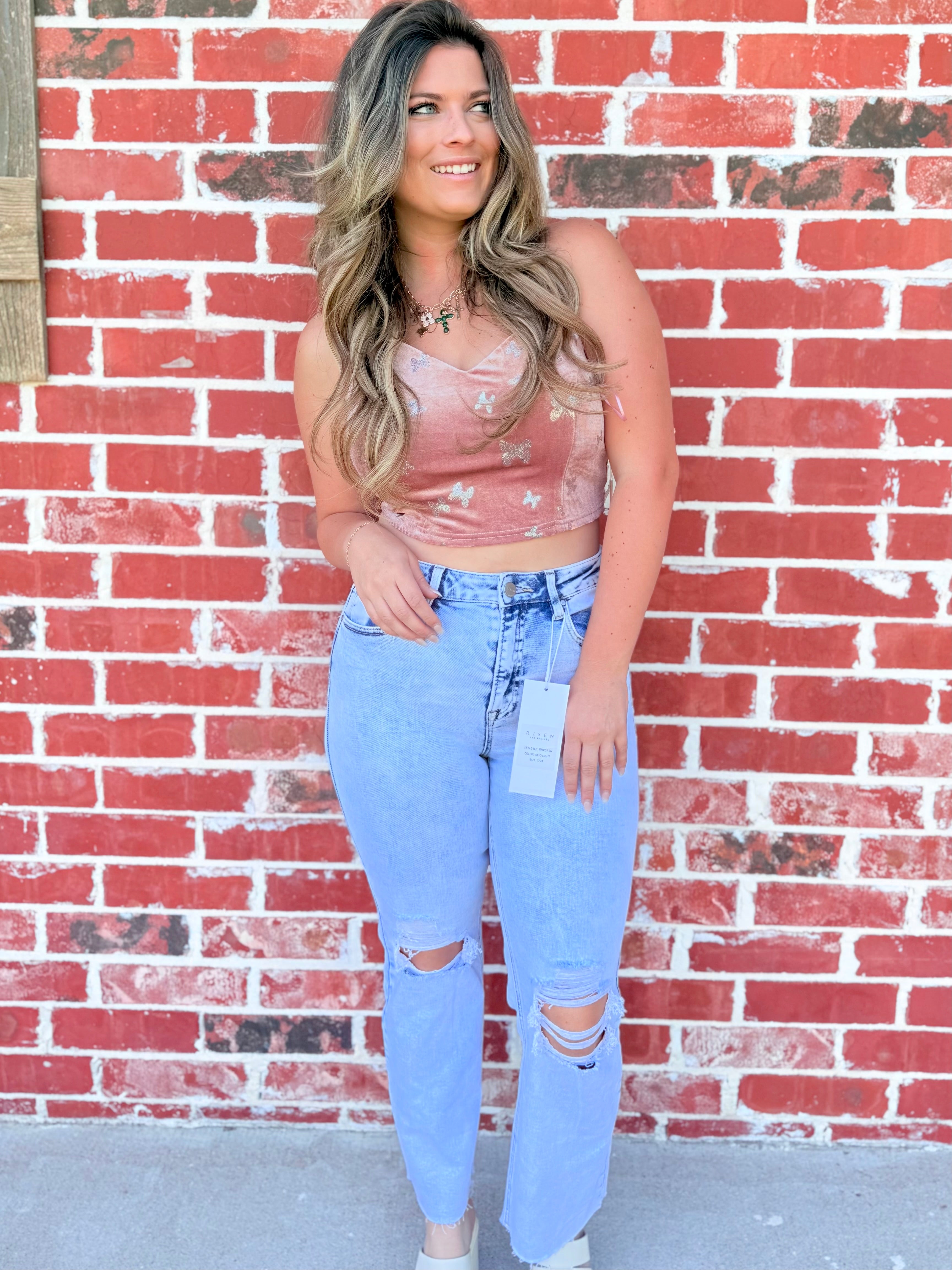 Float into effortless style with the Butterfly Bliss Lace-Up Crop Tank—a dreamy, lightweight woven top that’s equal parts playful and flirty. Featuring a delicate butterfly print, a flattering V-neckline, and an eye-catching lace-up crisscross back design, this top is a must-have for warm-weather styling. Perfect for pairing with denim, skirts, or layered under a cardigan, this piece is made to turn heads effortlessly.